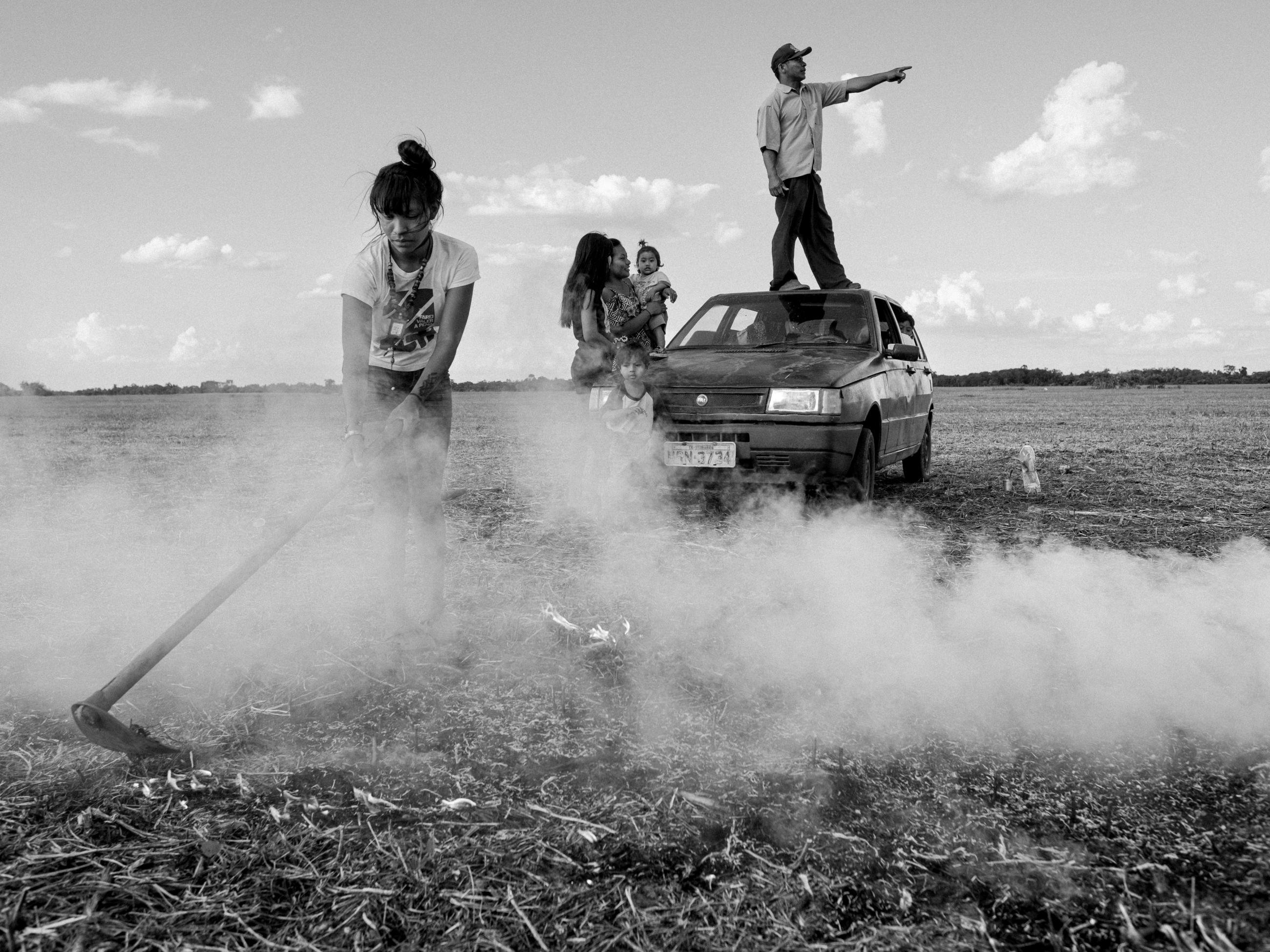 Within Brazil, far from the Amazon, the Retomada da Terra movement aims to reclaim agricultural lands taken from the indigenous Guaraní people. Although this struggle pits them against agribusiness syndicates, coordinated efforts have empowered some Guaraní to reclaim parts of their sacred territory, which once flourished as the Atlantic Forest, but have since been replaced by soy and corn monocultures. The Guaraní’s fight isn’t solely for survival, but encompasses environmental advocacy, an opposition to chemical pesticides and the promotion of reforestation. In a landscape dominated by monoculture fields, where forests once thrived, they emerge as custodians of the land, often paying the ultimate price with their lives.