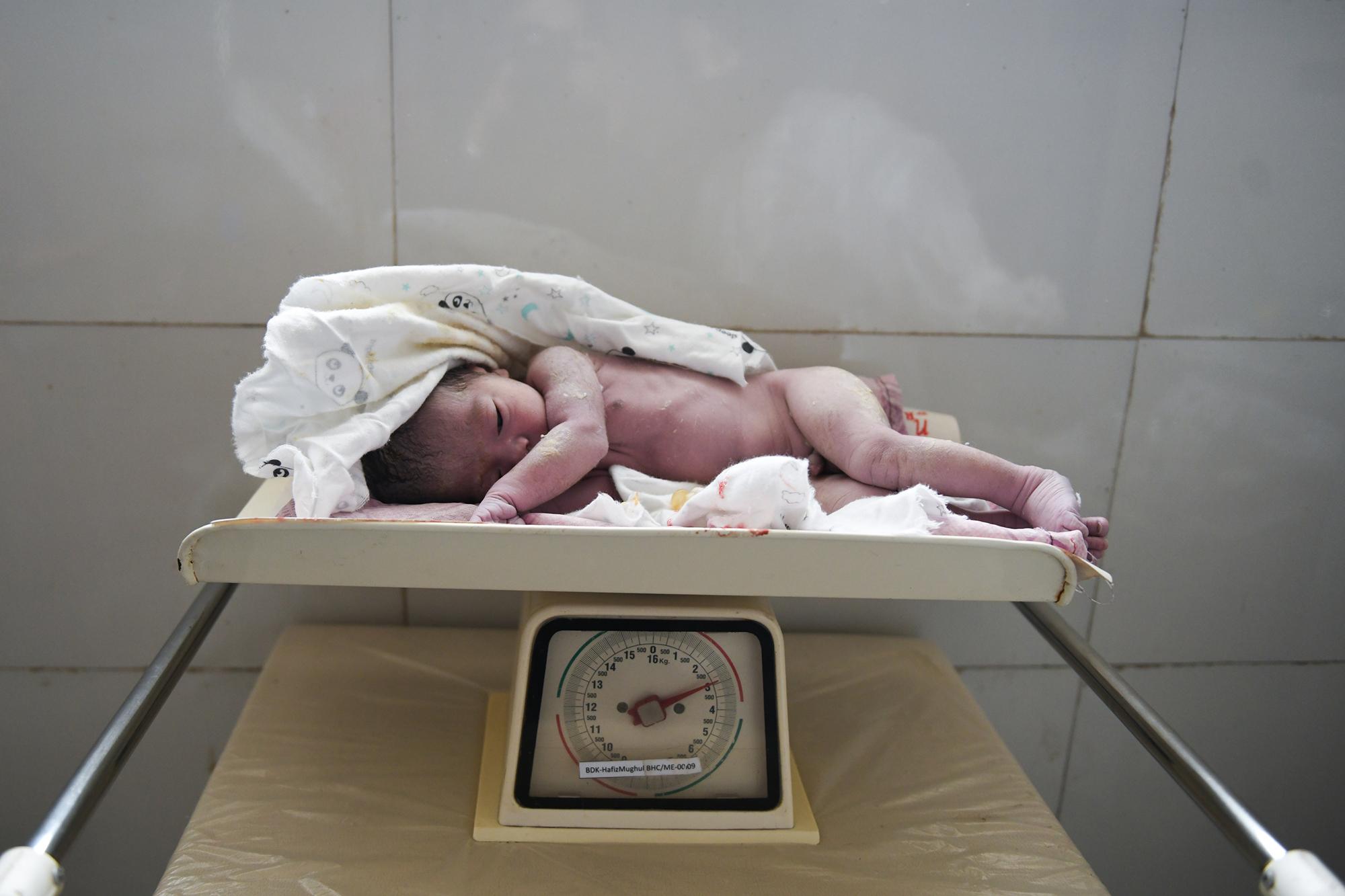 18 November 2023, Badakhshan: A newborn baby, delivered to a 20 year-old mother, being weighed. The baby, not breathing when born, was resuscitated by midwife Hadijah. It took her three hours to reach Hadijah’s clinic after attempting to deliver the baby at home for three days.