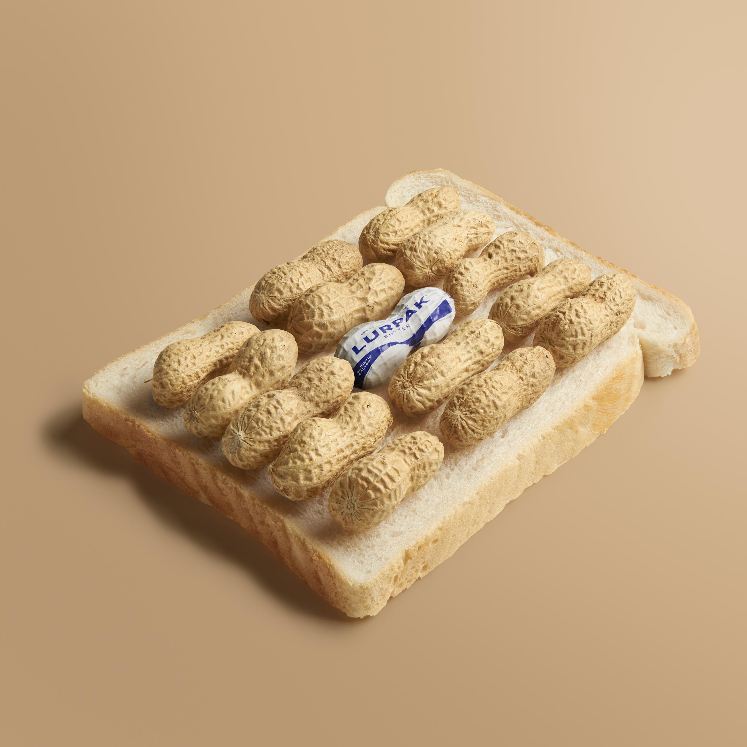 This conceptual still-life combines peanuts in shells on bread, with one of them dressed as a pack of butter. The result is an especially crunchy peanut butter sandwich – bon appetit!