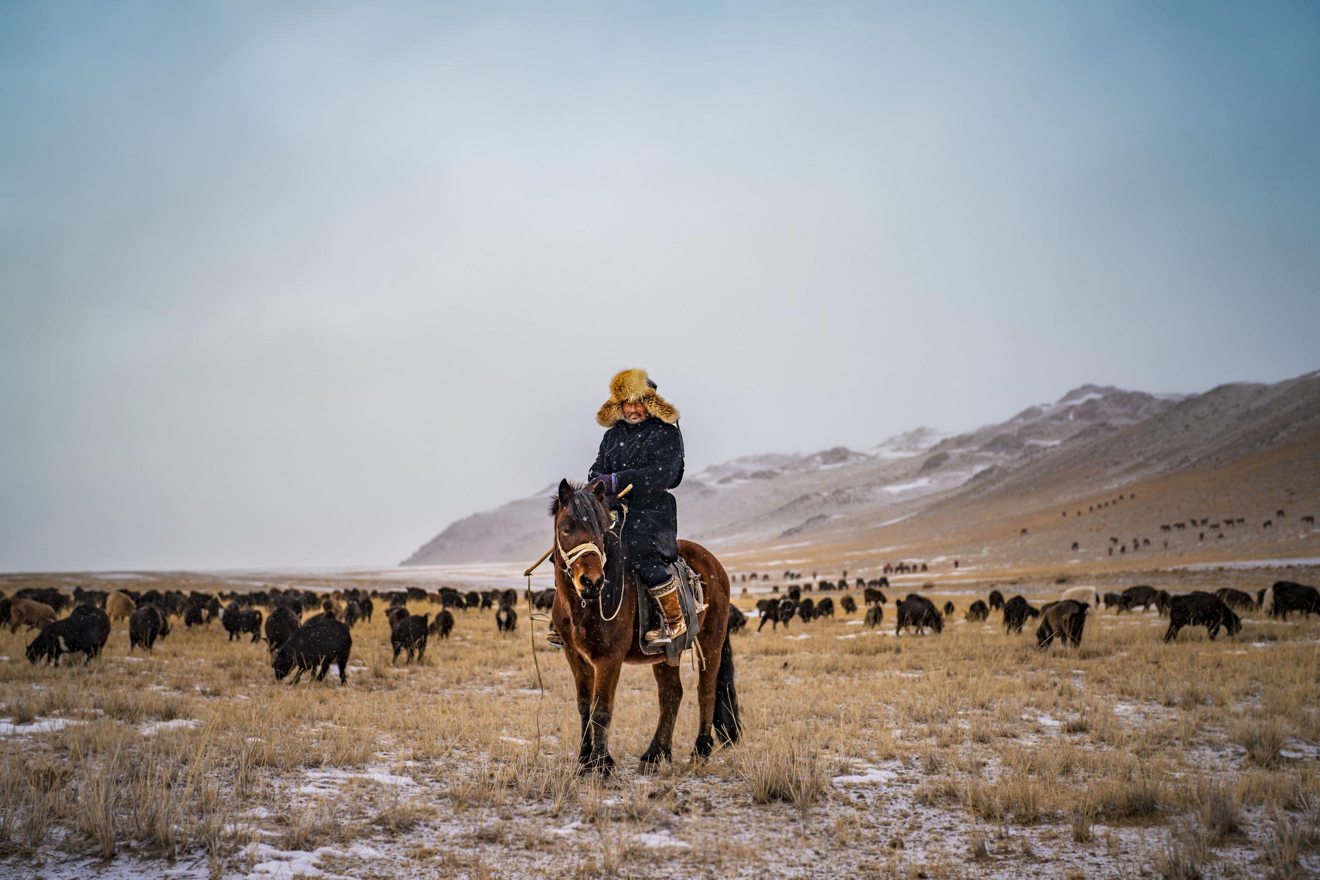 A nomadic Mongolian shepherd guides a herd of cashmere goats through the harsh, wintry landscape. Despite the biting cold and swirling snow, the shepherd remains steadfast, embodying resilience and dedication to a centuries-old way of life.