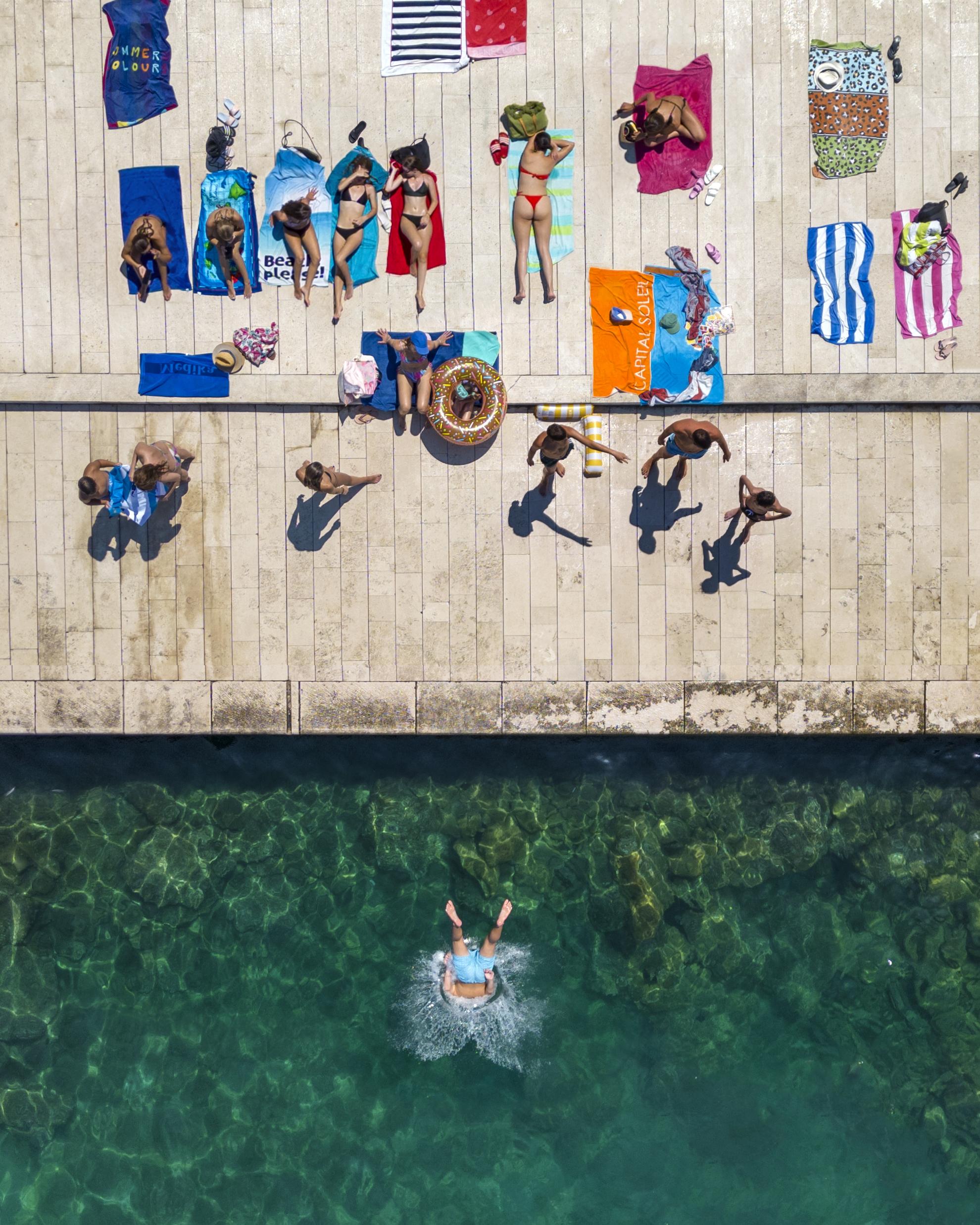 This photograph was taken in Split, Croatia. It captures a scene of relaxation on a hot day by the Adriatic Sea.