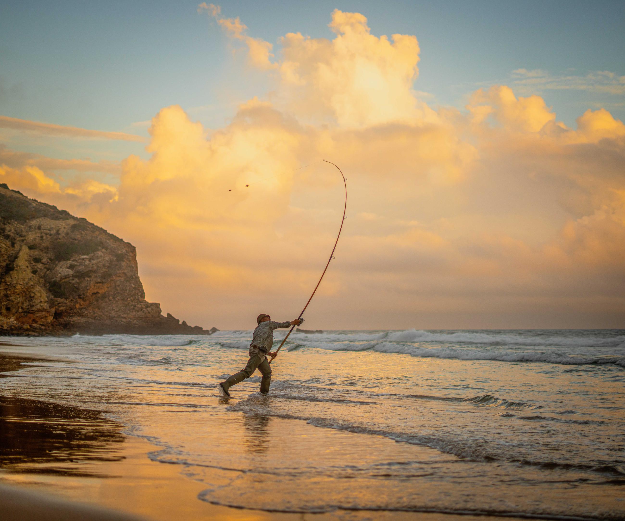 A local fisherman casts into the surf, just after sunset in the Algarve region of southern Portugal.