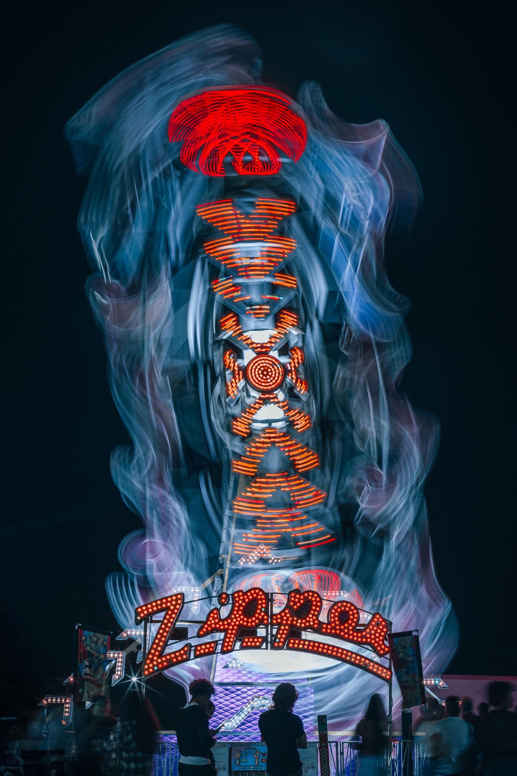 The Zipper is a spinning ride at the San Mateo County Fair, California, which is known for its thrilling light trails. The photographer used a wide-angle lens and a slow shutter speed to create a sense of motion and speed, experimenting with various angles to see how the light trails and subjects interacted. Background elements such as silhouettes of people and fair structures were included to add depth and context.