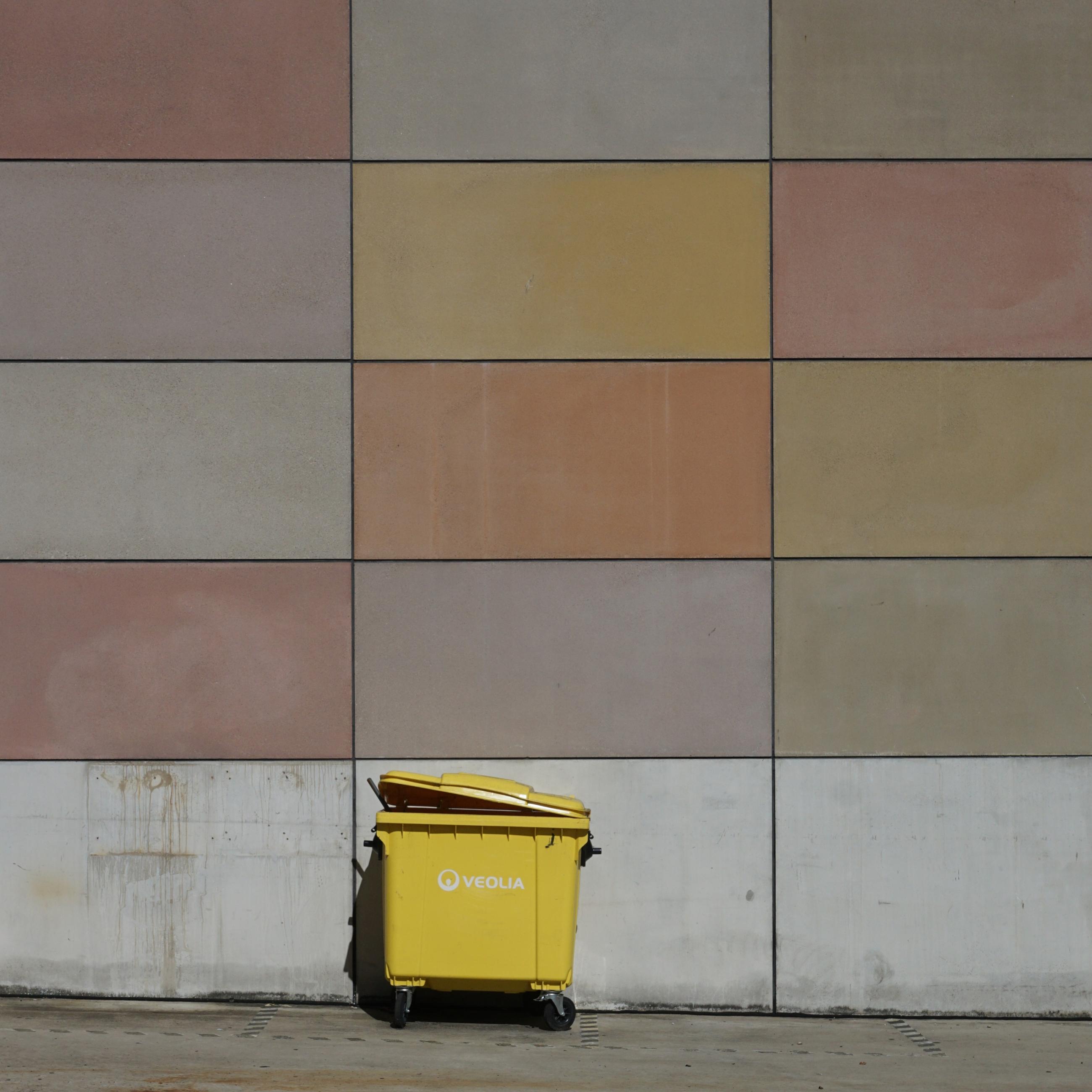This photograph was taken in the German city of Fürth. The yellow bin creates a complementary focal point in front of the colour-block wall.