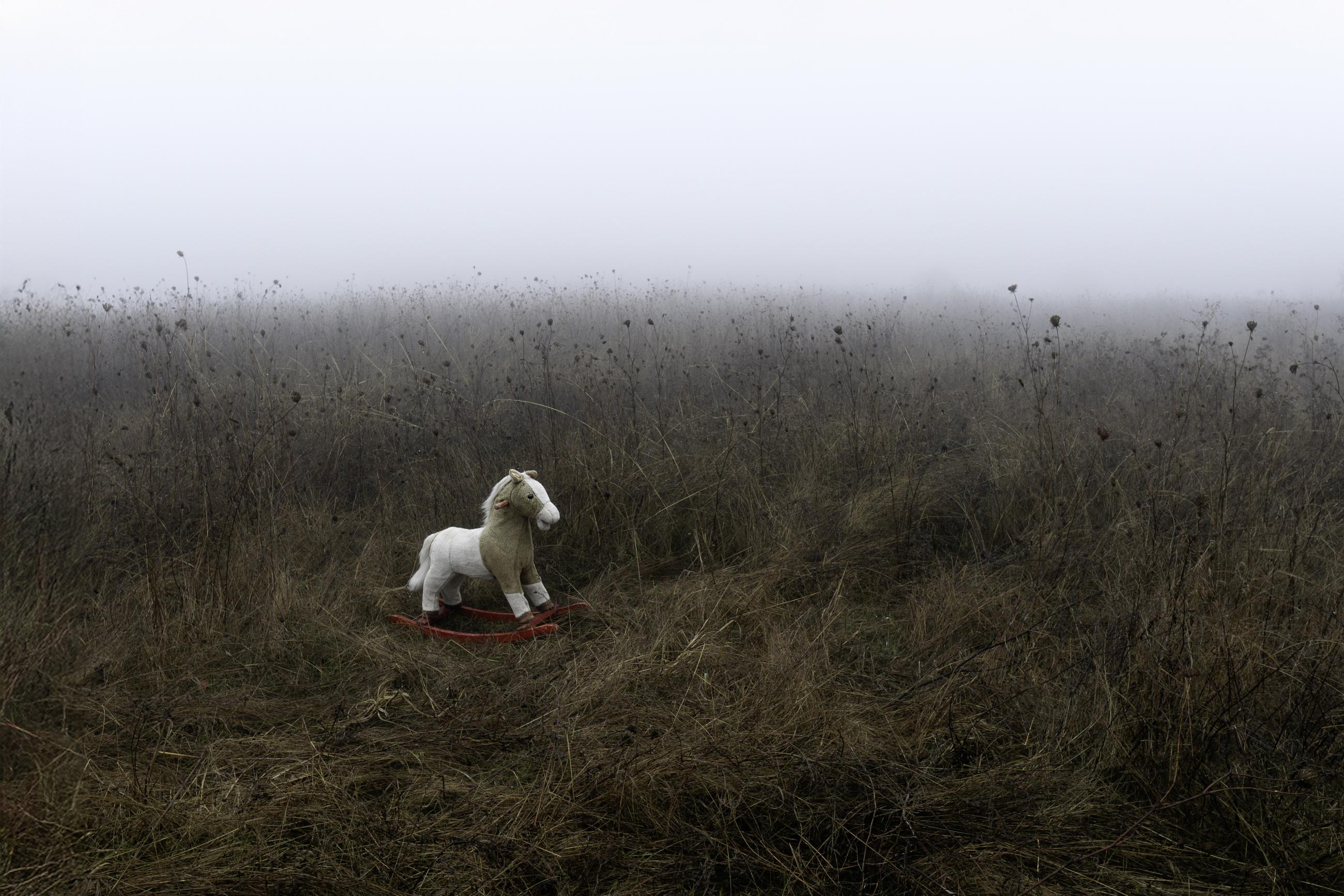 During a walk, the photographer discovered this toy standing abandoned in the fog.