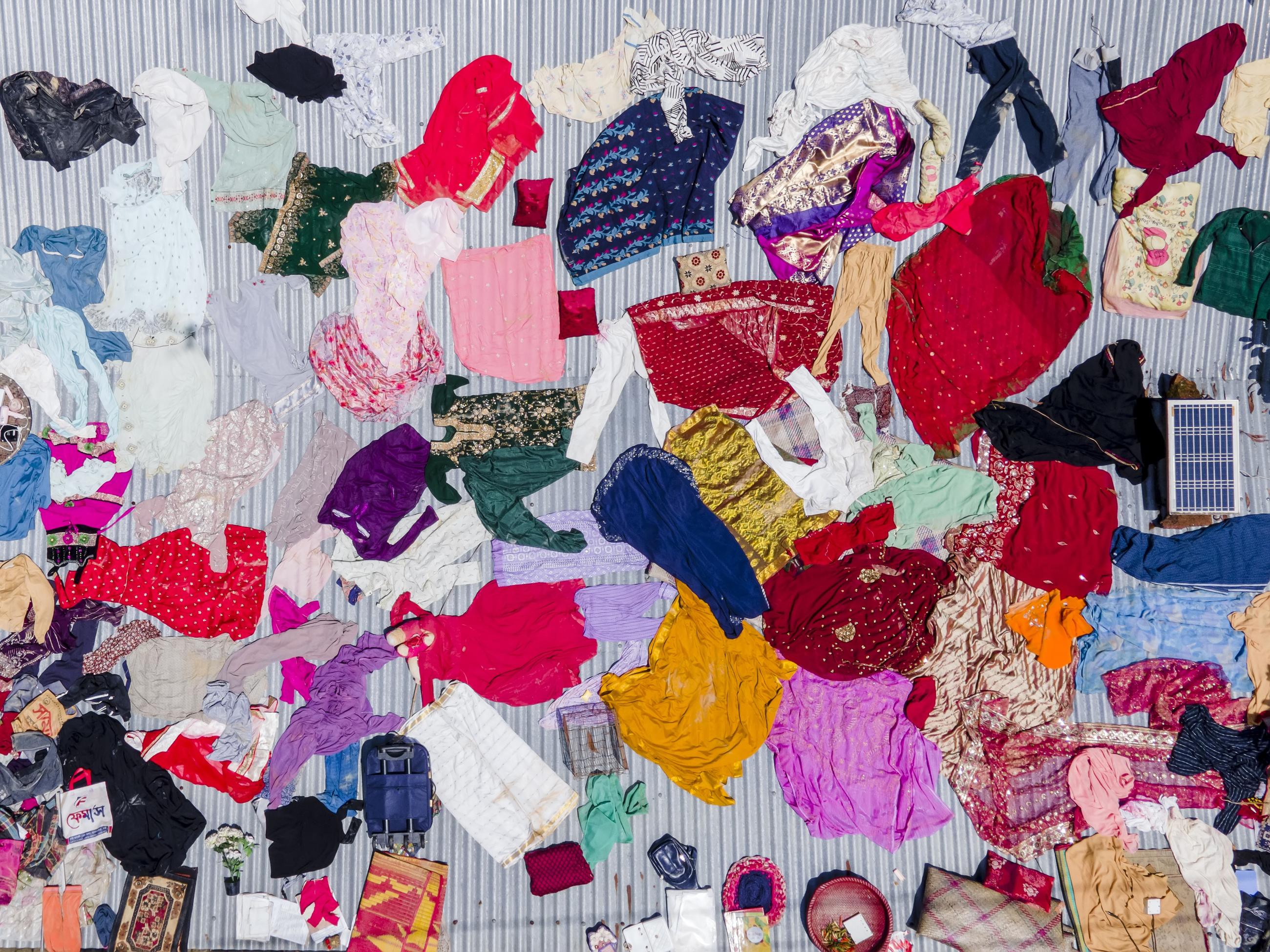 A family dries clothes and essential items on the roof of their home in Gopal village, south east Bangladesh, following devastating flash floods. The floods killed at least fifty two people and affected multiple districts; more than five million people were affected in some way.