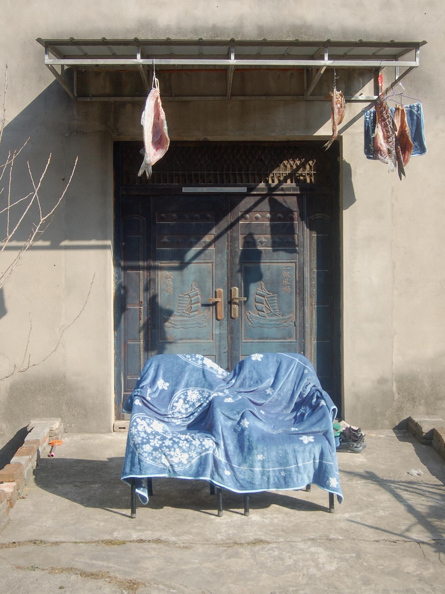 As the Chinese Spring Festival approached, the photographer came across a family preparing for the celebrations in the traditional way. They had cured fish hanging up – a common practice leading up to the festival – but it was the striking blue seating that stood out in the scene.