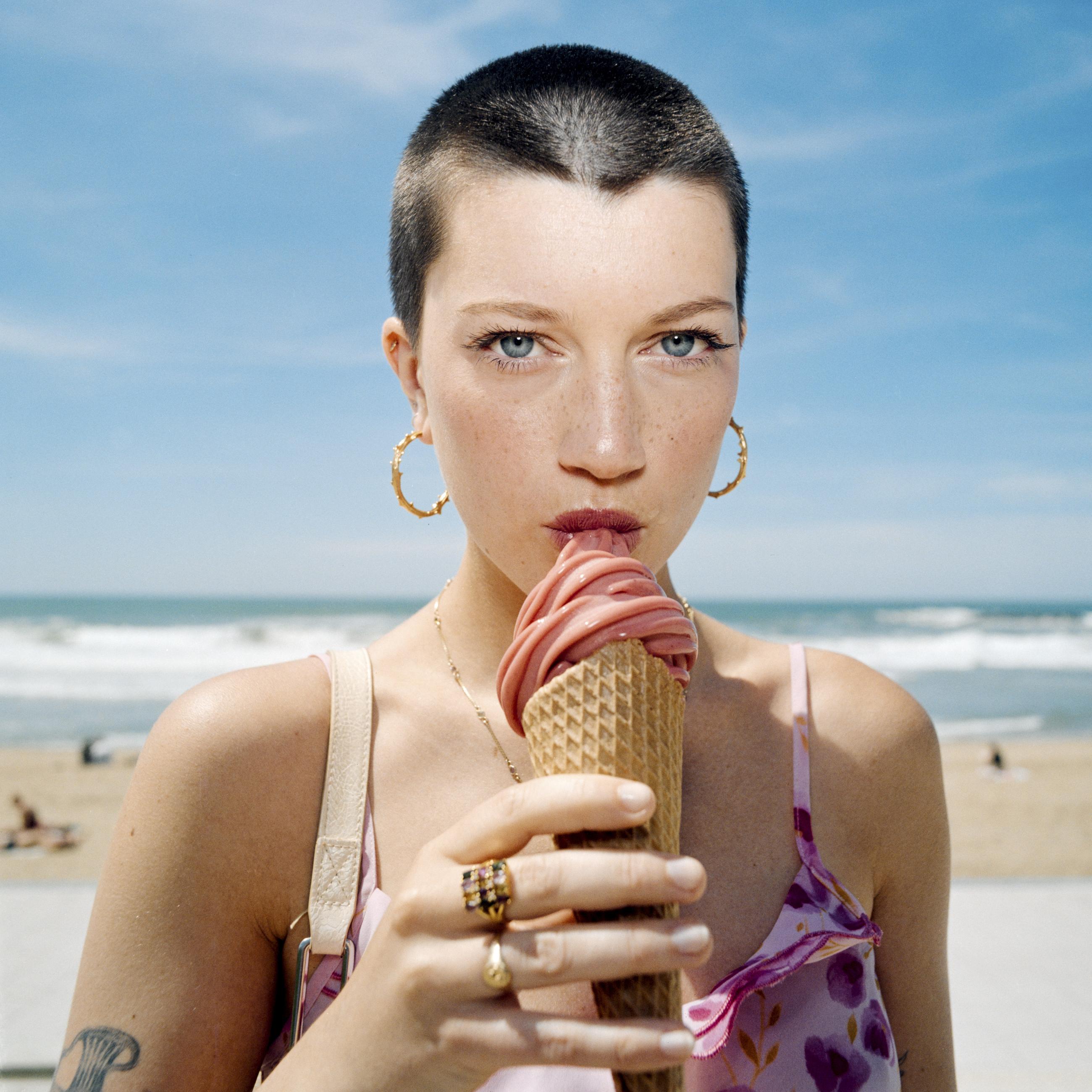On a warm summer day, Juliette casually eats her ice cream at the beach in Biarritz, France.