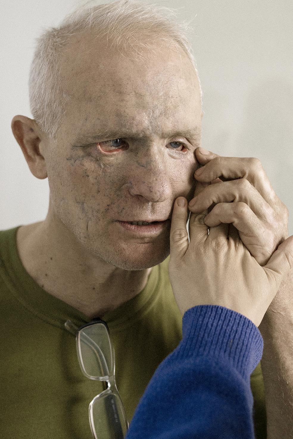 This photograph was taken at the Superhumans Center, a specialist rehabilitation centre in Ukraine for children and adults affected by the war. The subject, Oleh, asked ‘Do you want to touch my plate?’ and drew the photographer's hand to his face, which had undergone multiple reconstructive surgeries. The photographer describes the moment as one of the most touching of the entire shoot.