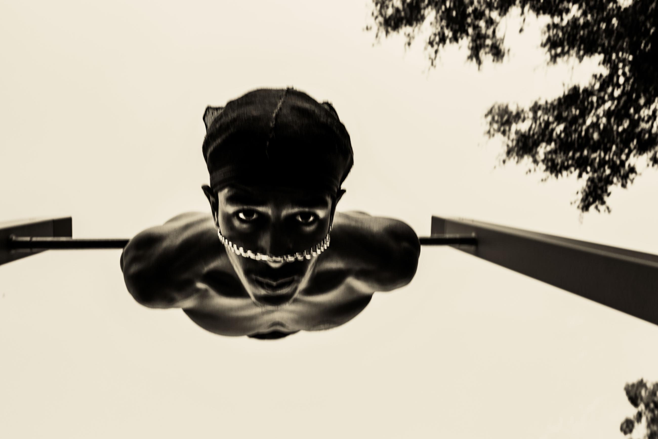 A young man practices acrobatics on a bar in a park in the early morning. The photographer slid under him to capture this portrait from ground level.