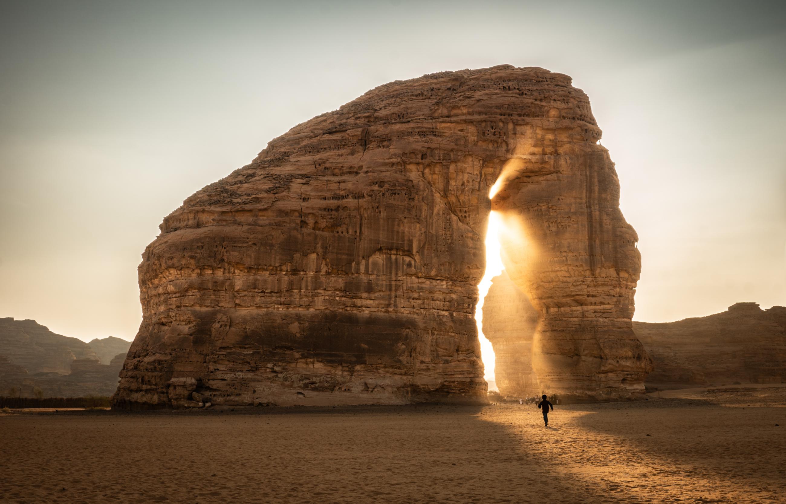 The soft rays of the sun envelop Elephant Rock, a majestic rock formation in Saudi Arabia, during a breathtaking sunset. The scene is enriched by the presence of a child running towards the light, adding a sense of wonder and the spirit of exploration.