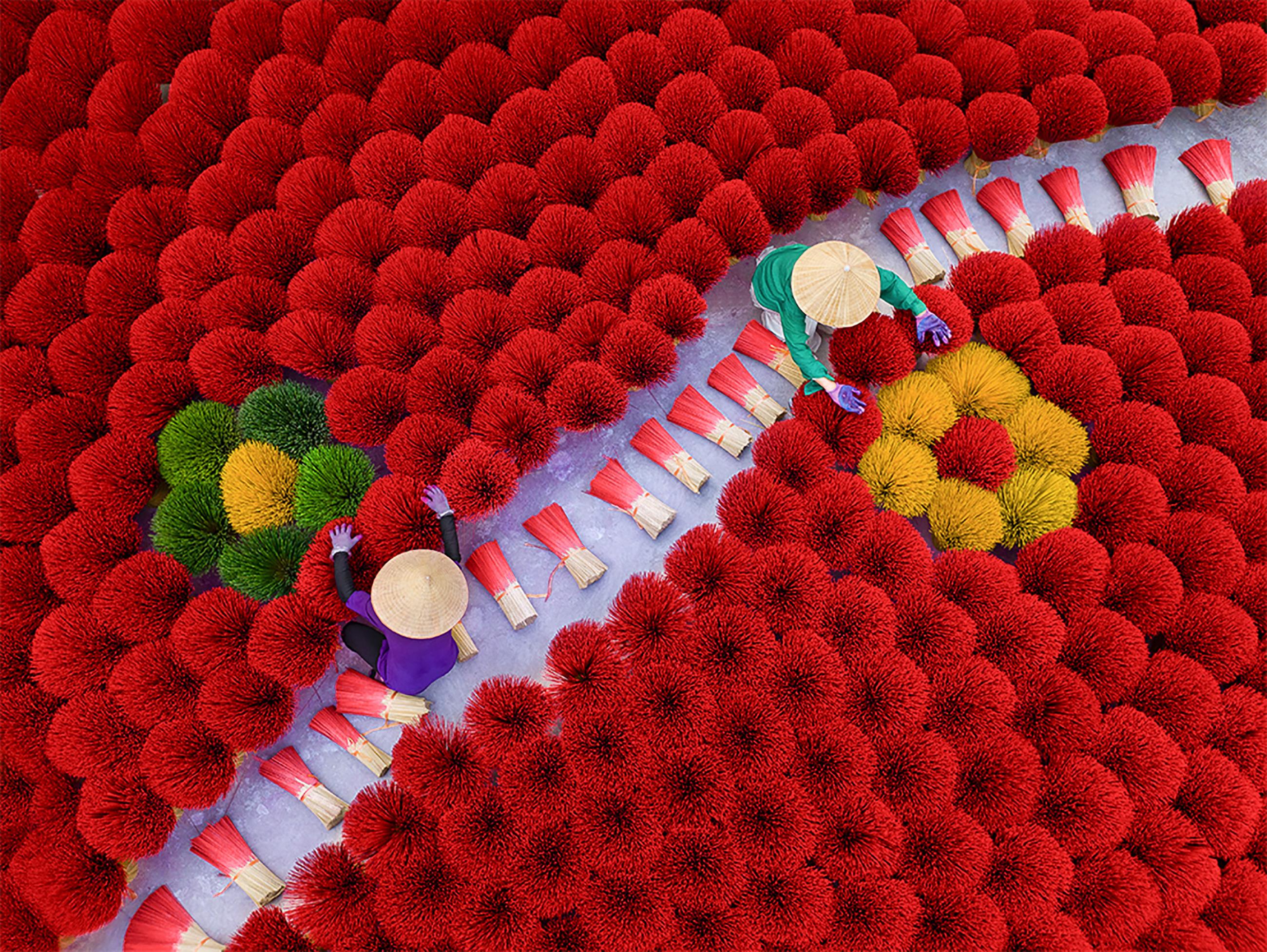 Workers dry colourful incense before taking it to sell at the market. The incense is dried on the ground, where it takes on the form of beautiful flowers. According to Vietnamese tradition, incense connects the present world with the spiritual world.