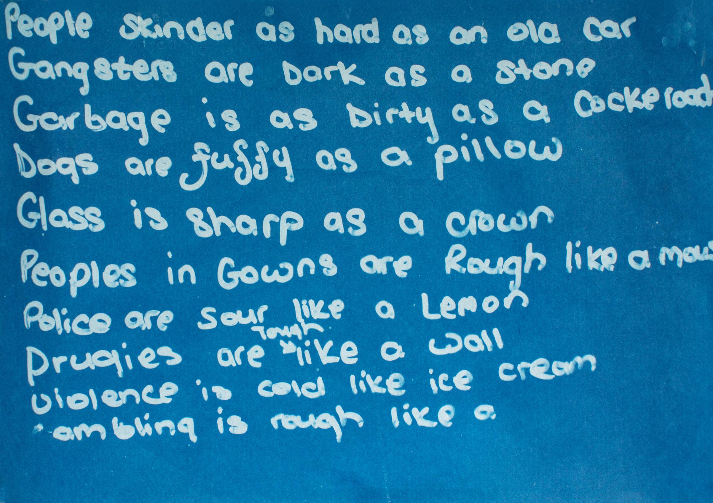 Making our way home from school is a simple, nostalgic, universal activity that we can all relate to. This project explores the tumultuous public lives of young people in the gang-governed Cape Flats area of Cape Town, South Africa, where their daily commute carries the risk of death. Using handmade, lo-fi experimental techniques, this project explores how young people have to walk to and from school avoiding the daily threat of gang crossfire. Through poetry, analogue photography, drawings, collages and cyanotypes, an intimate portrayal of adolescence amidst stark social divides is created that offers a rare insight into this confusing and challenging world.