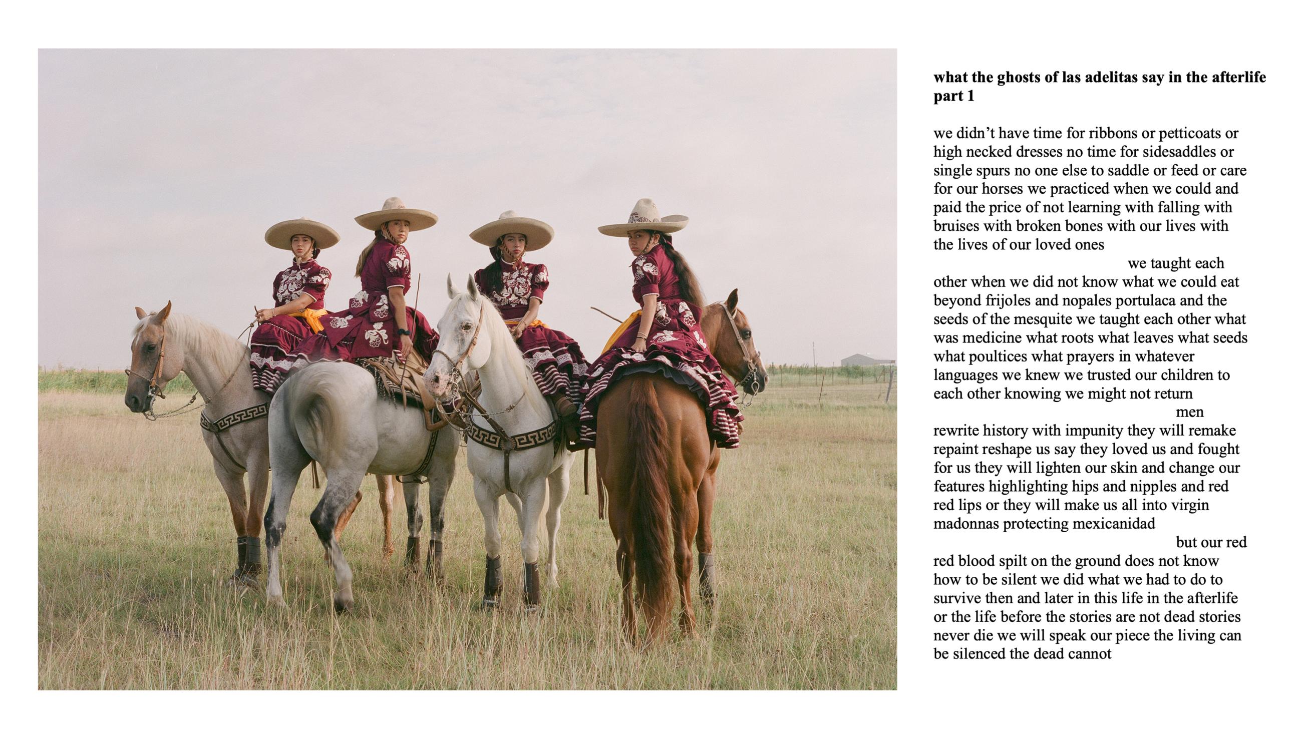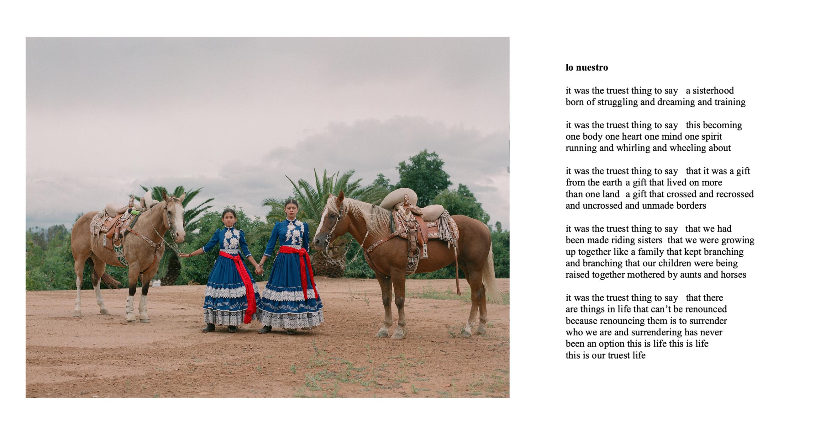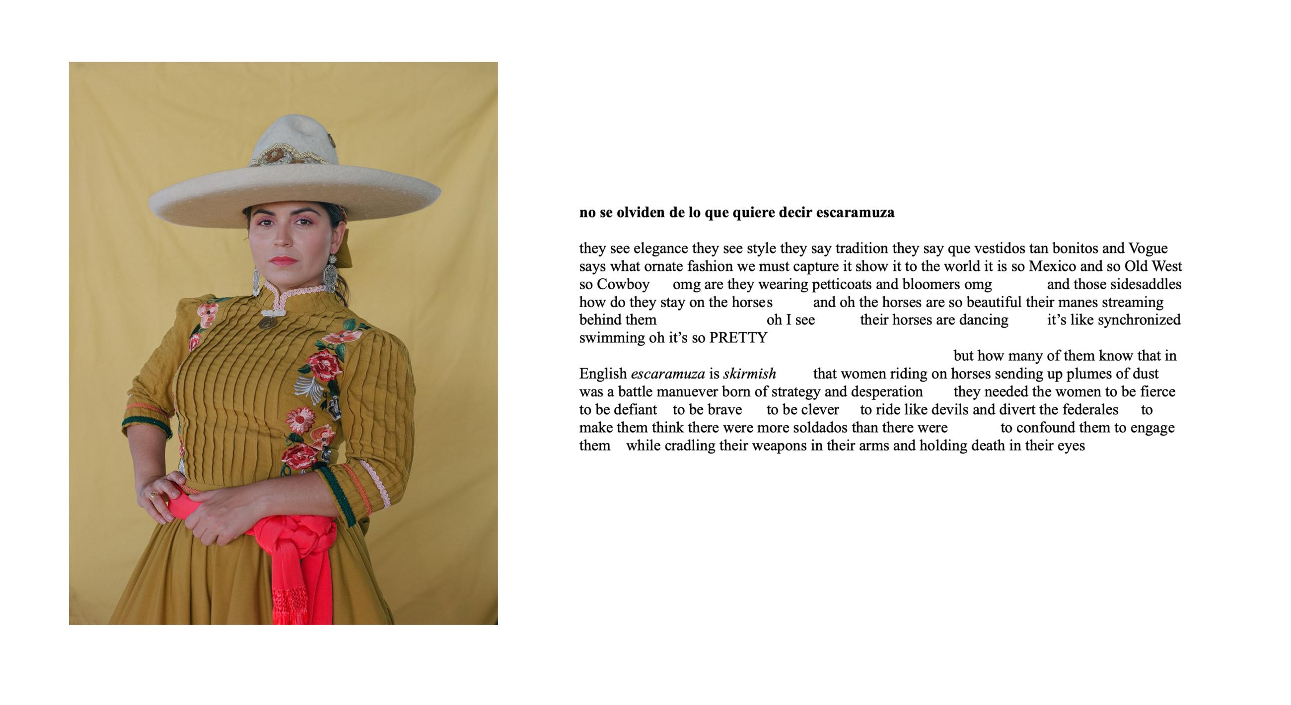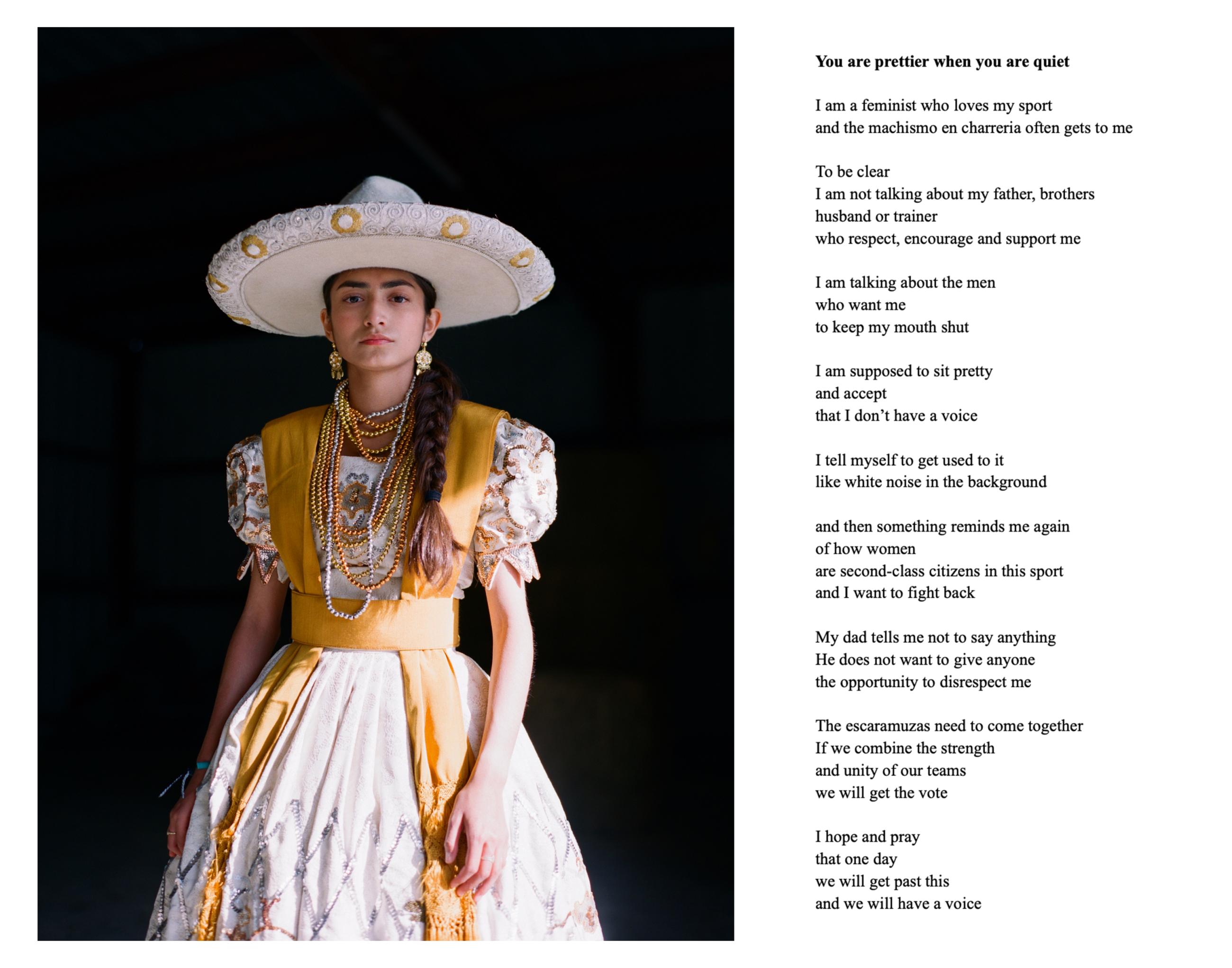 Escaramuza is the sport of all-female precision horse riding, where teams execute meticulous manoeuvres while riding side-saddle at high speed, wearing traditional Mexican attire. Through photographic portraiture, poetry and in-depth interviews, Escaramuza, the Poetics of Home considers how the escaramuza tradition persists in the present-day United States, what it means for the identity of its Mexican and Mexican-American female practitioners, and how it fosters a profound sense of belonging. This work explores the roles of family, immigration and gender dynamics within escaramuza and Charrería culture in the USA, drawing historical parallels to the ‘soldaderas’ who fought in the Mexican Revolution and inspired the escaramuza tradition. The work combines photographic portraits by the artist, and poetry by the 2023 Texas State Poet Laureate, ire’ne lara silva, and Angelina Sáenz, an award-winning educator, poet and writing project fellow at UCLA.