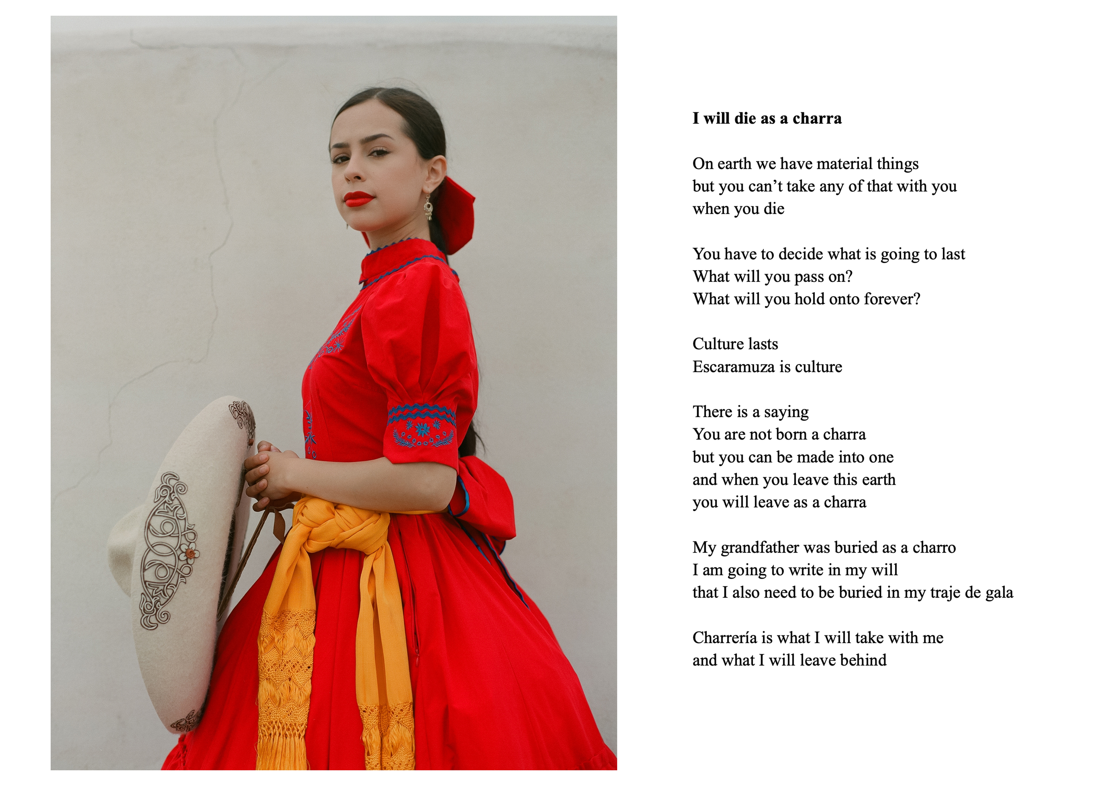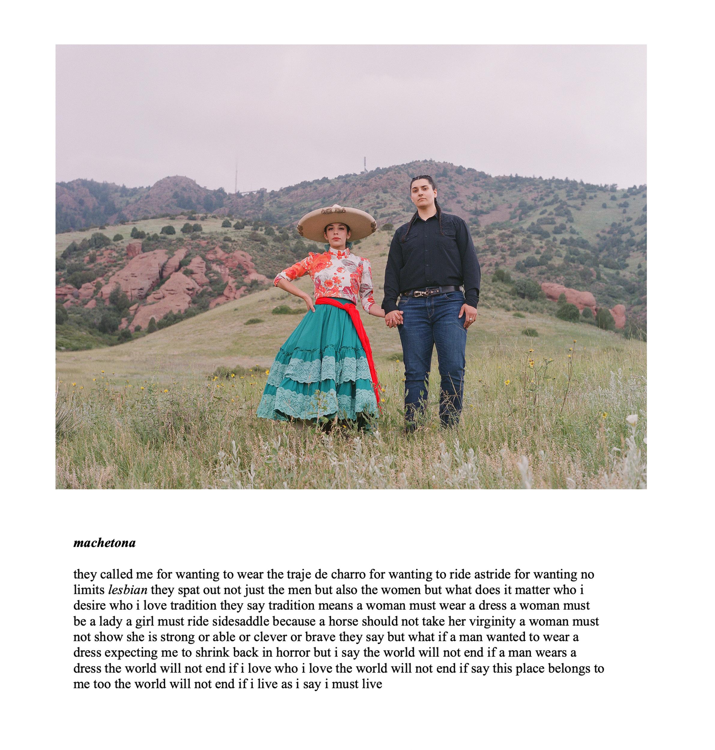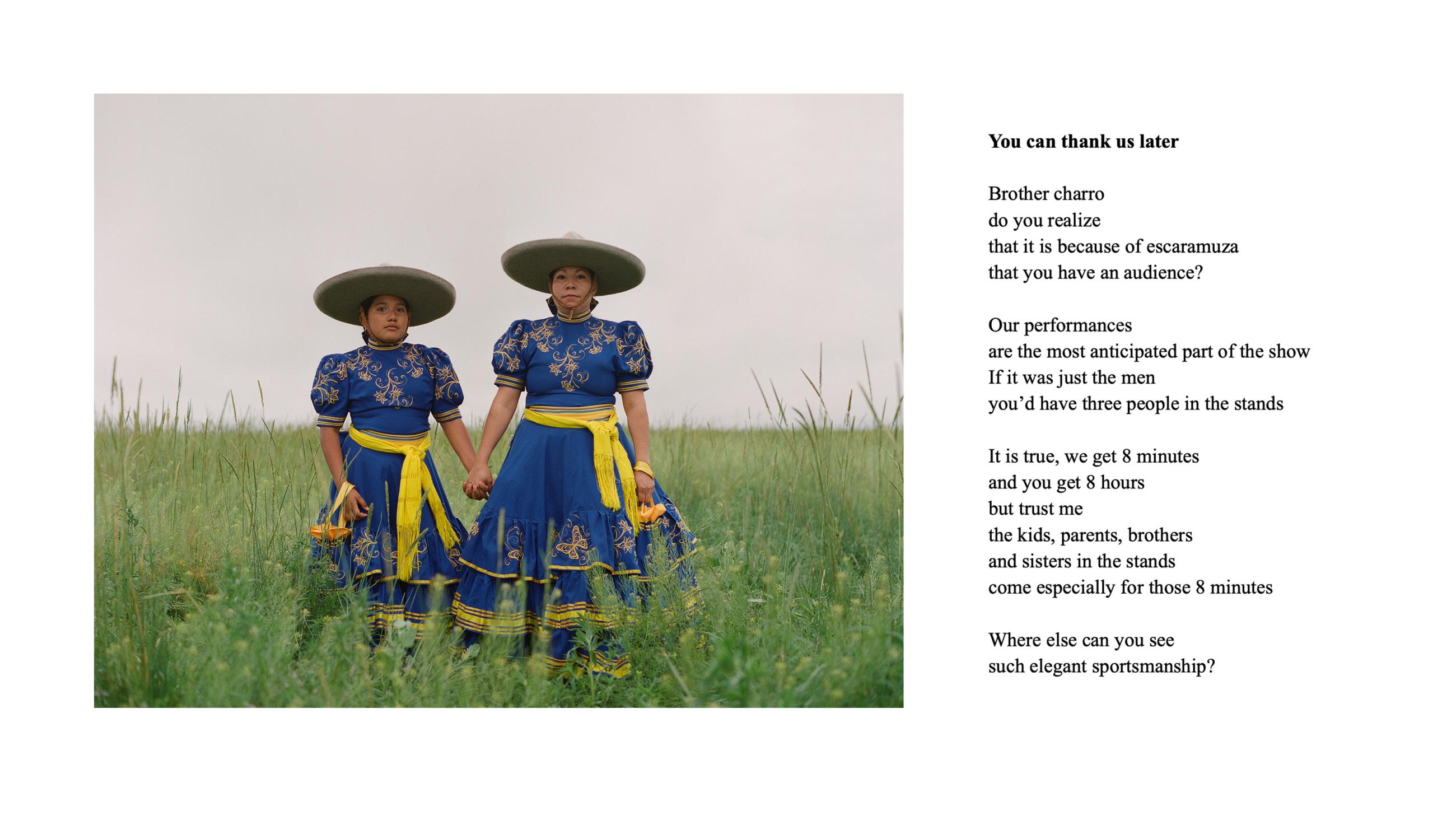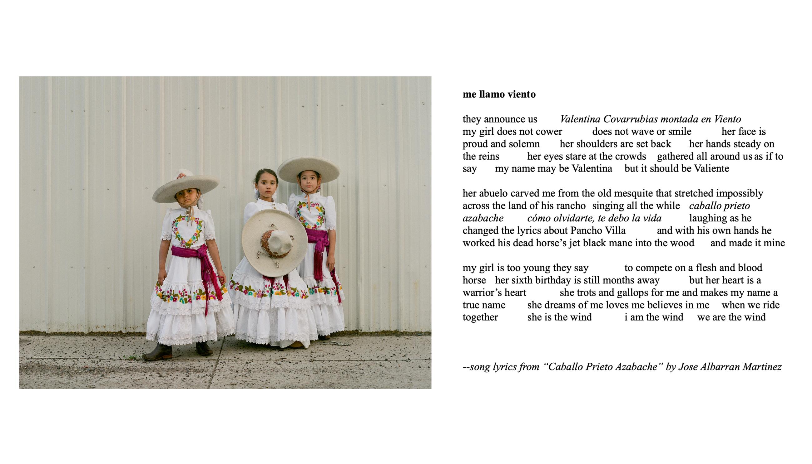 Escaramuza is the sport of all-female precision horse riding, where teams execute meticulous manoeuvres while riding side-saddle at high speed, wearing traditional Mexican attire. Through photographic portraiture, poetry and in-depth interviews, Escaramuza, the Poetics of Home considers how the escaramuza tradition persists in the present-day United States, what it means for the identity of its Mexican and Mexican-American female practitioners, and how it fosters a profound sense of belonging. This work explores the roles of family, immigration and gender dynamics within escaramuza and Charrería culture in the USA, drawing historical parallels to the ‘soldaderas’ who fought in the Mexican Revolution and inspired the escaramuza tradition. The work combines photographic portraits by the artist, and poetry by the 2023 Texas State Poet Laureate, ire’ne lara silva, and Angelina Sáenz, an award-winning educator, poet and writing project fellow at UCLA.