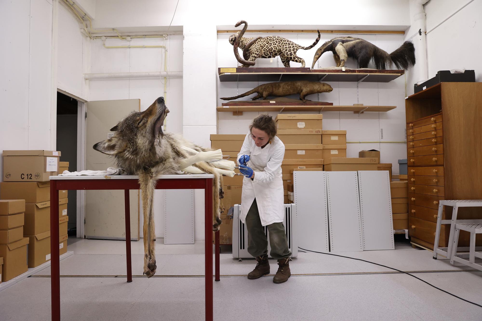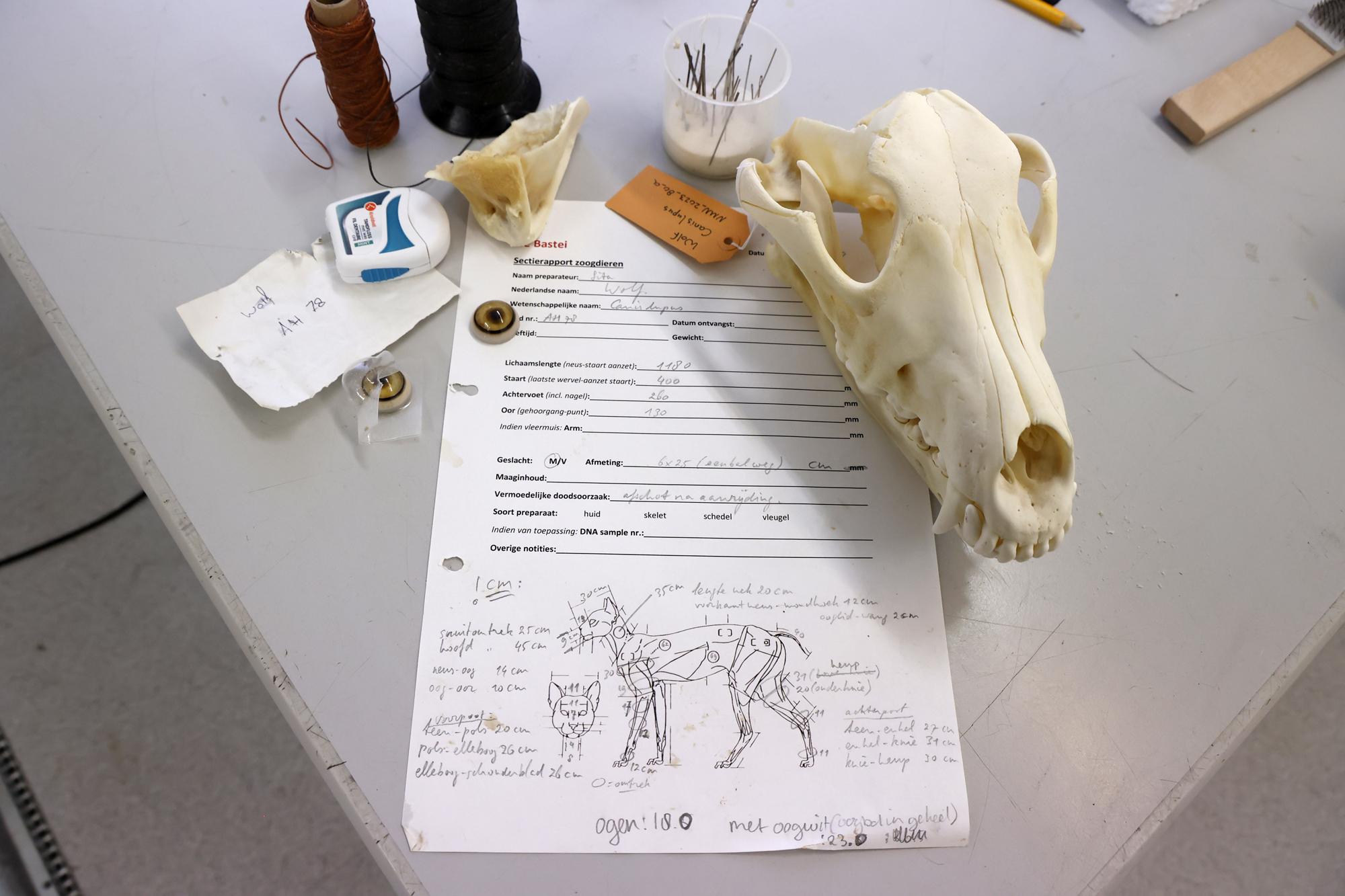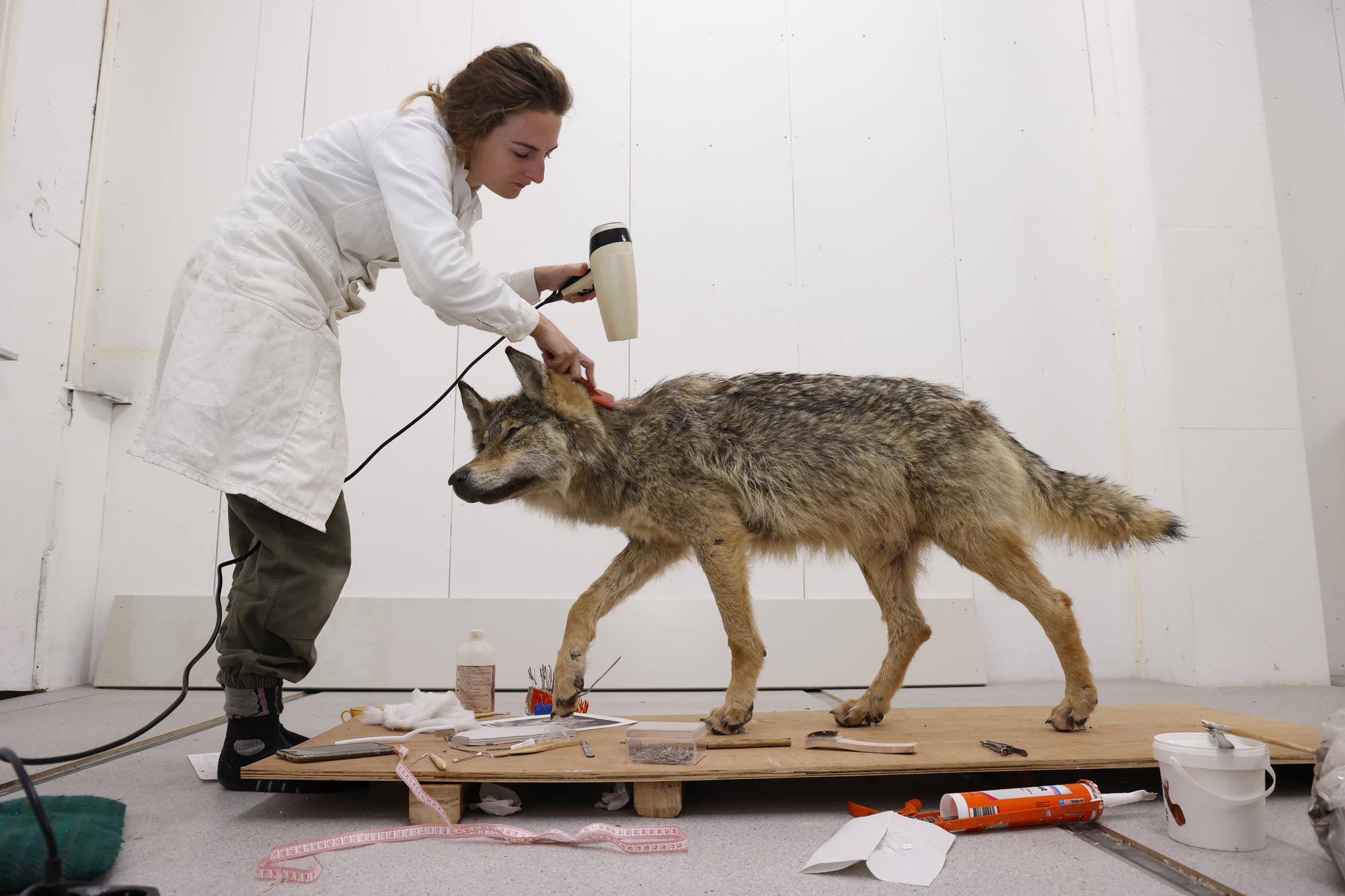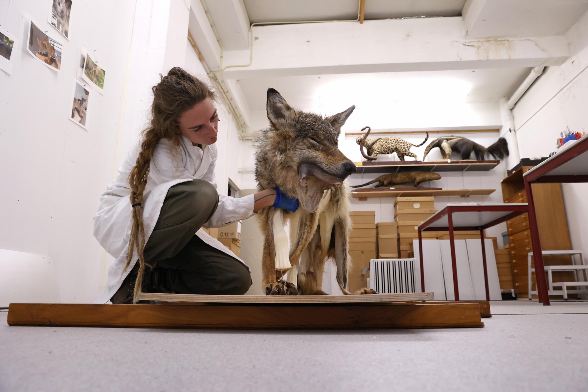 This one-year-old male wolf, identified with the file name GW2937m, was hit by a car when he was crossing the A12 between Duiven and Zevenaar in the Netherlands. Although the animal survived the immediate accident, it was so badly injured that it had to be euthanised. It was then given to a taxidermist, Sita van Hoorn, to prepare for the Museum De Bastei in Nijmegen.