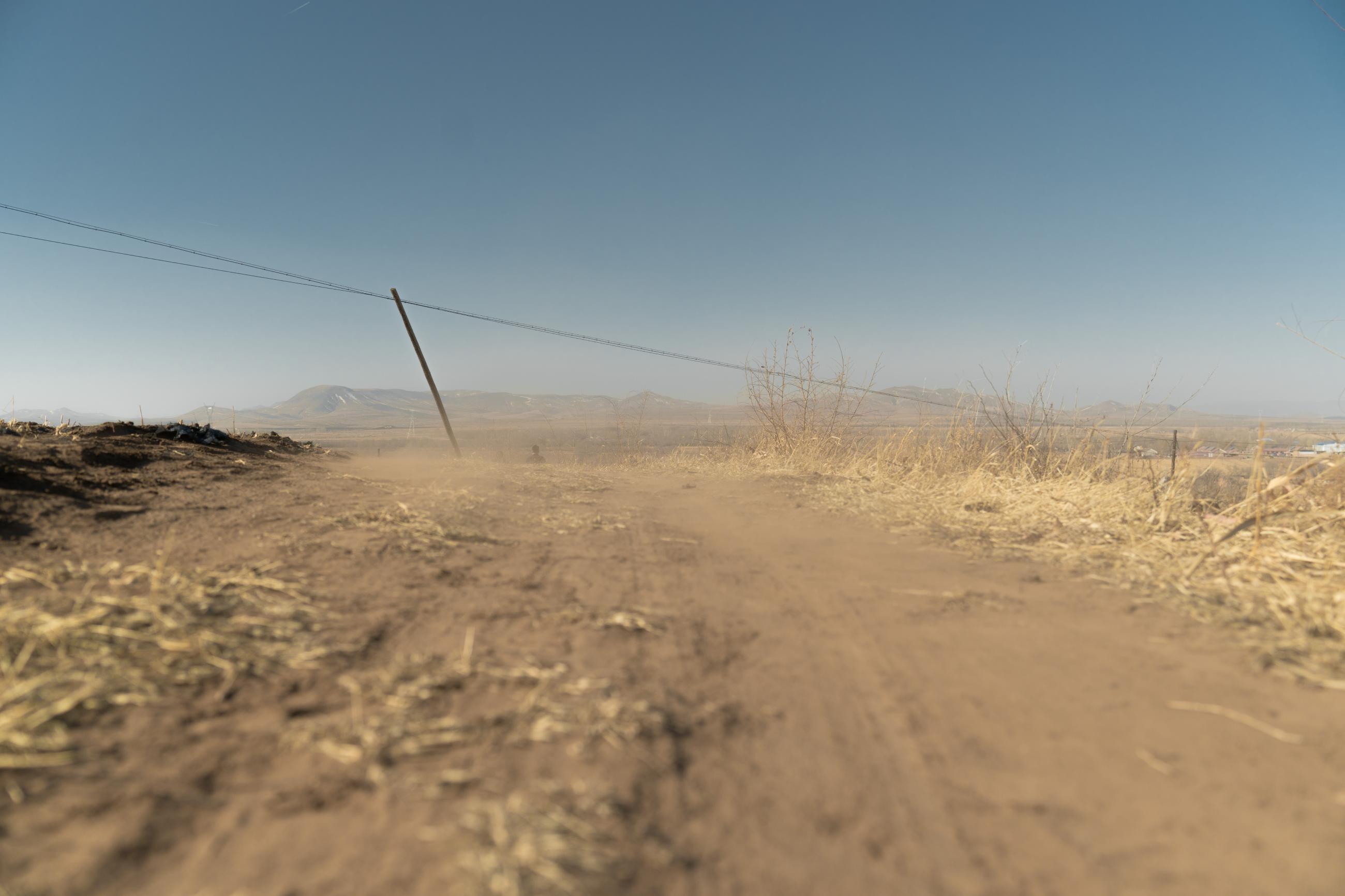 A path leading out of the village, a leaning telephone pole and two people about to disappear.