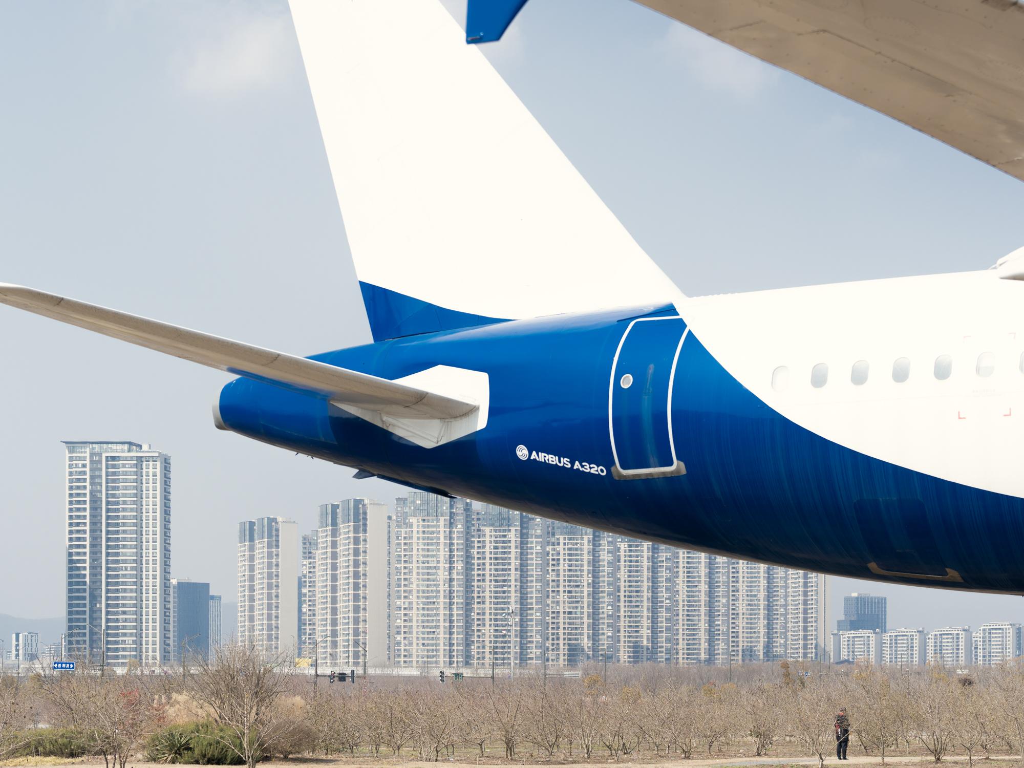 A plane – an important tool in the process of urbanisation – sits in front of high-density high-rise residential buildings.