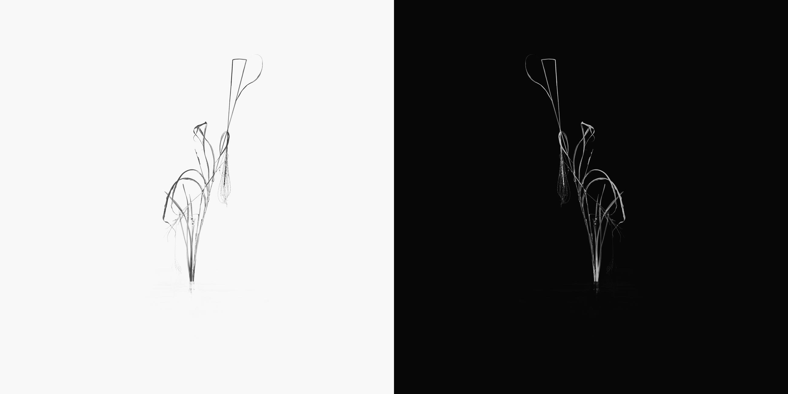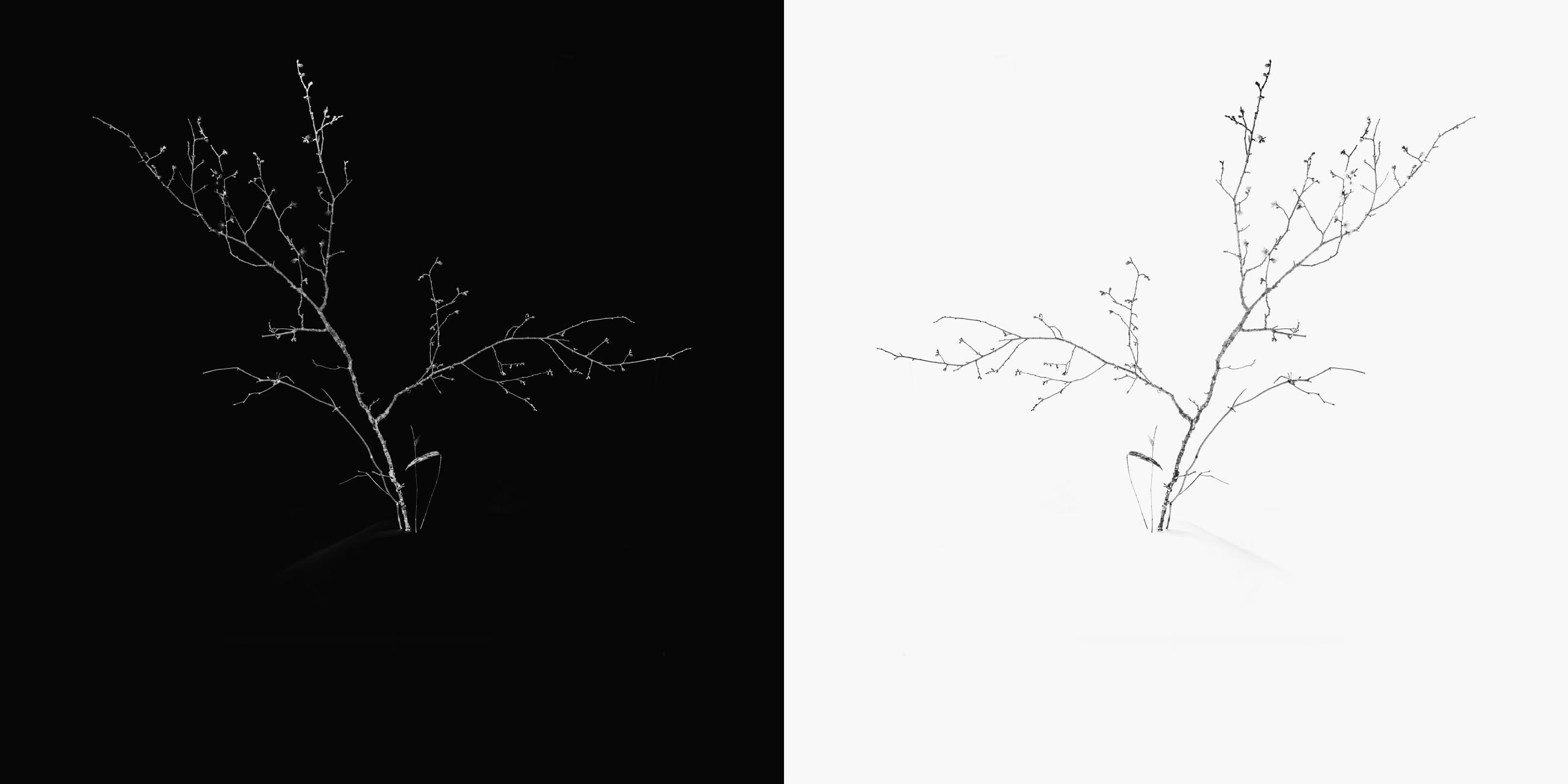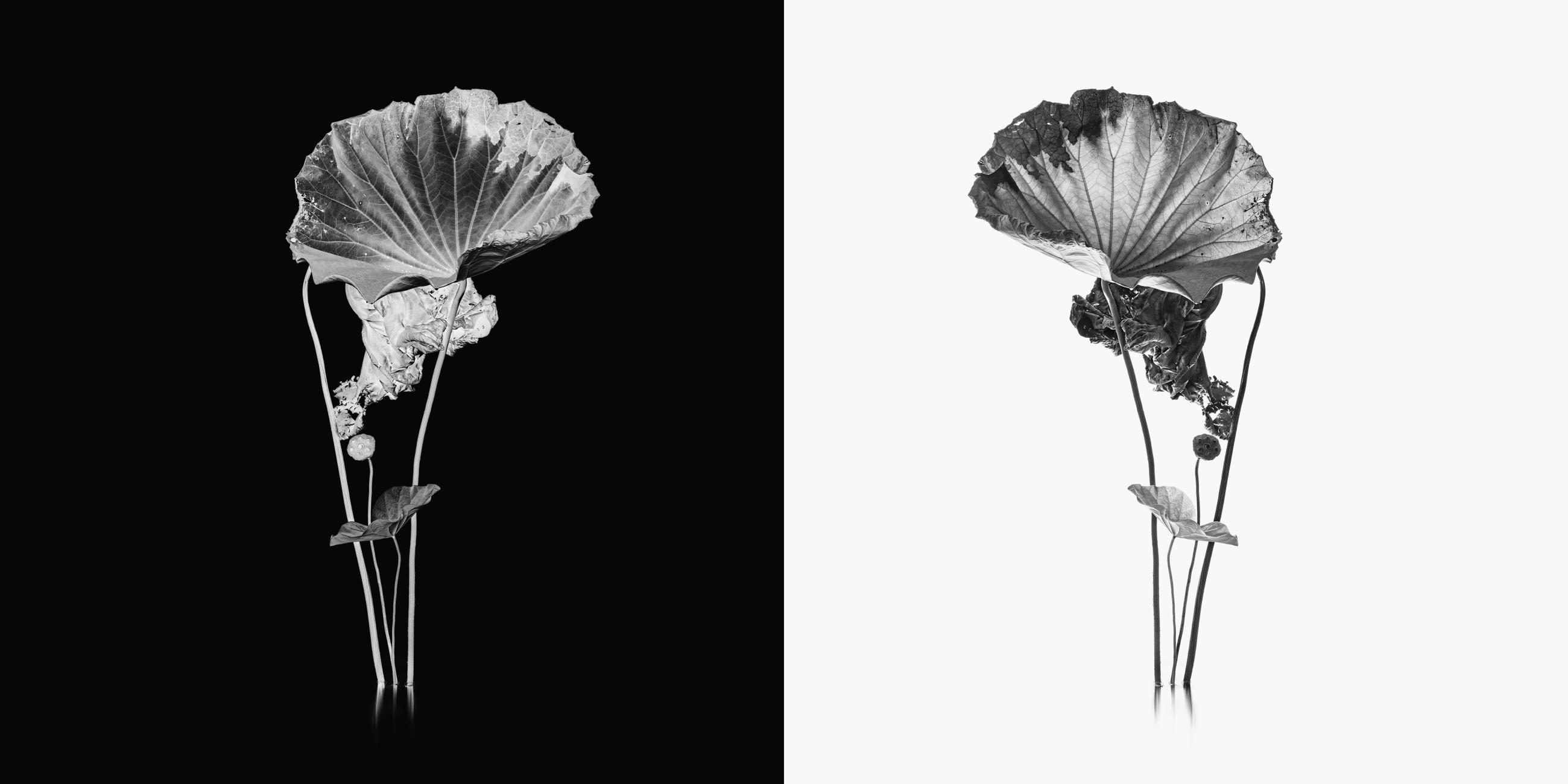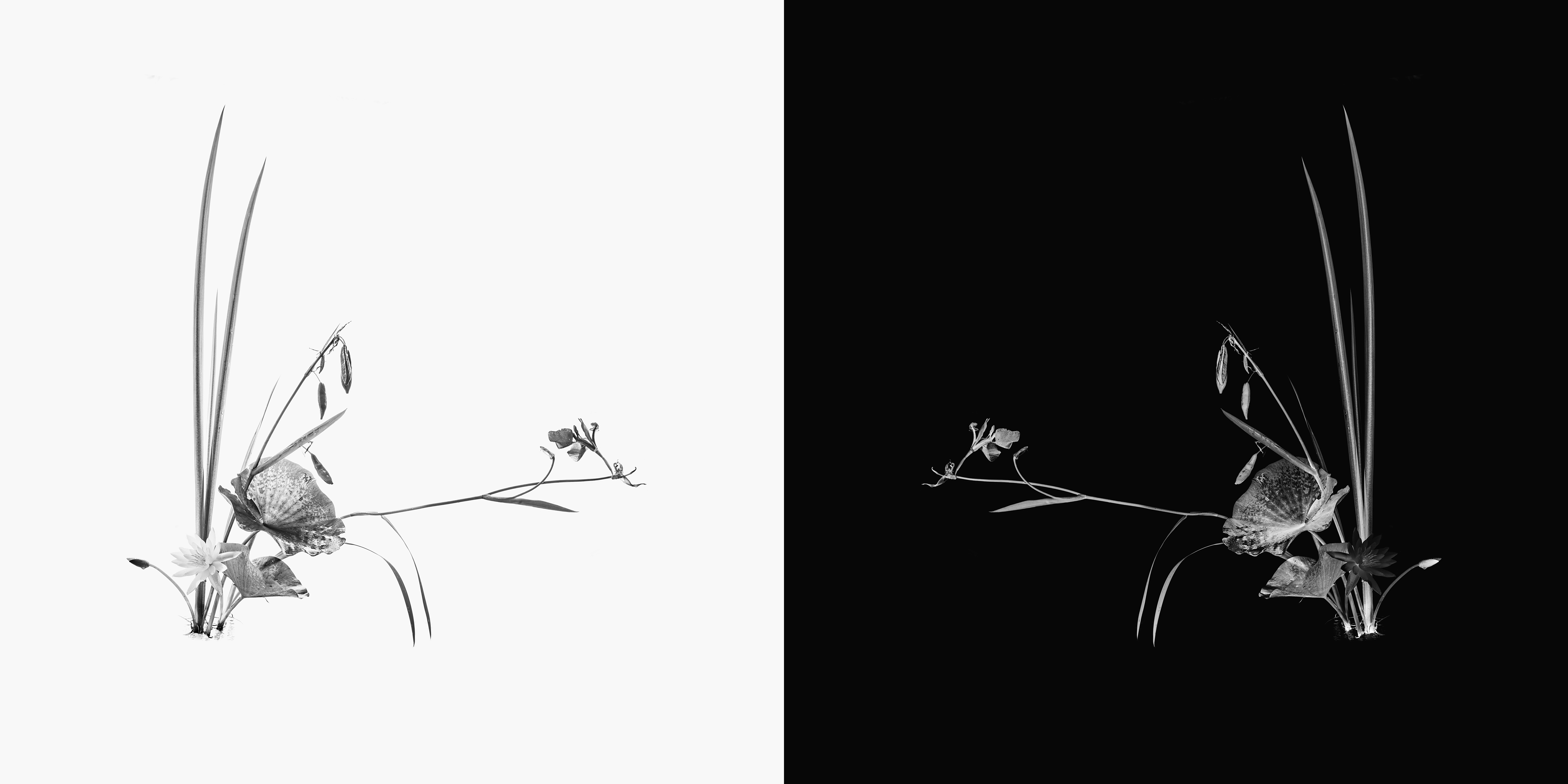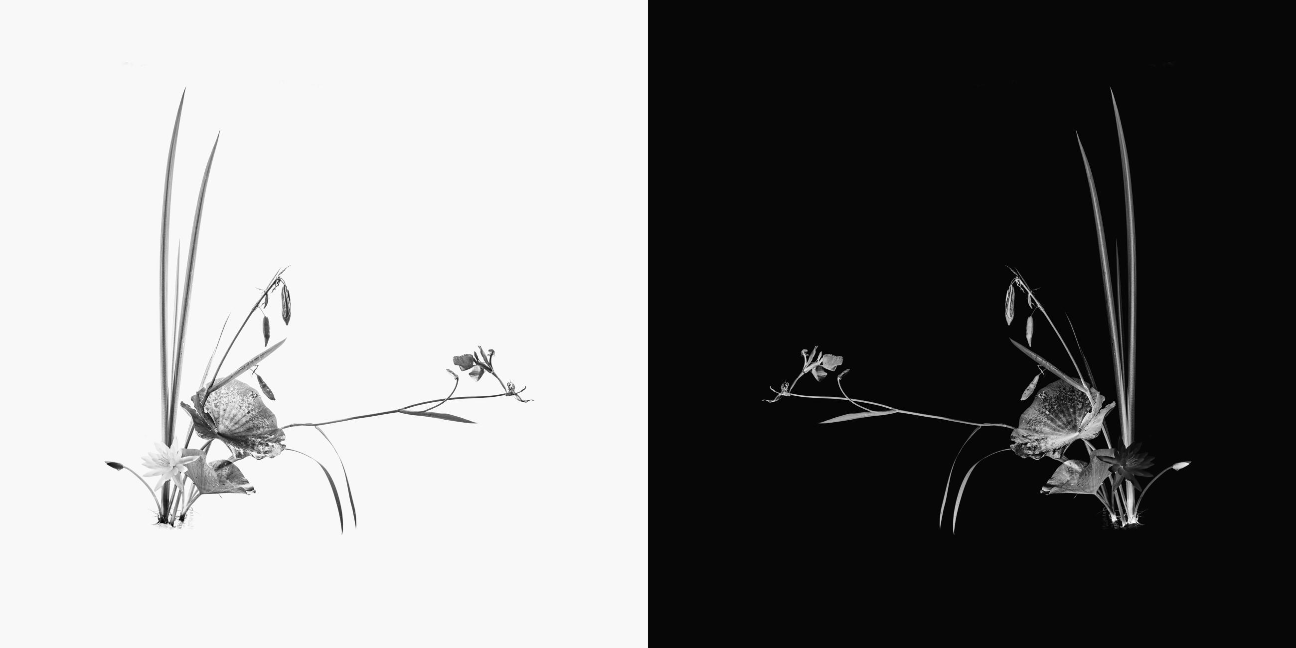 In this series, which is influenced by Japanese haiku, particularly the late poems of Basho, the photographer draws on the structure where kire (cut) opens ma (negative space). Flowers were gathered from Japan's mountains, cut at the point where the flower meets water. Backlit in front of a translucent backdrop, the negative space creates the impression of snow traces, reflections, or cracks in a snowfield, lake surface or dry earth. This space is not simply a background, but equal to the subject.