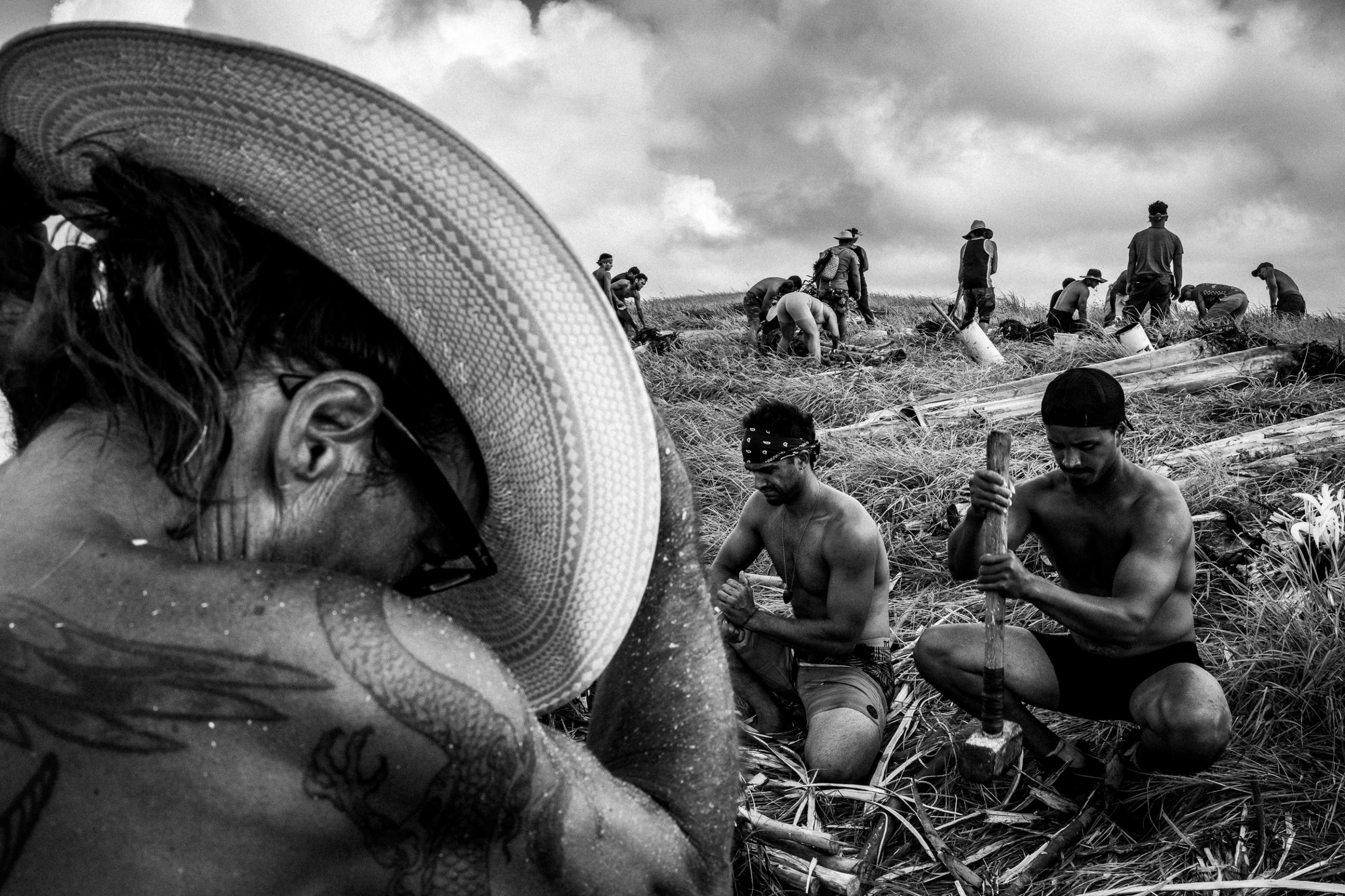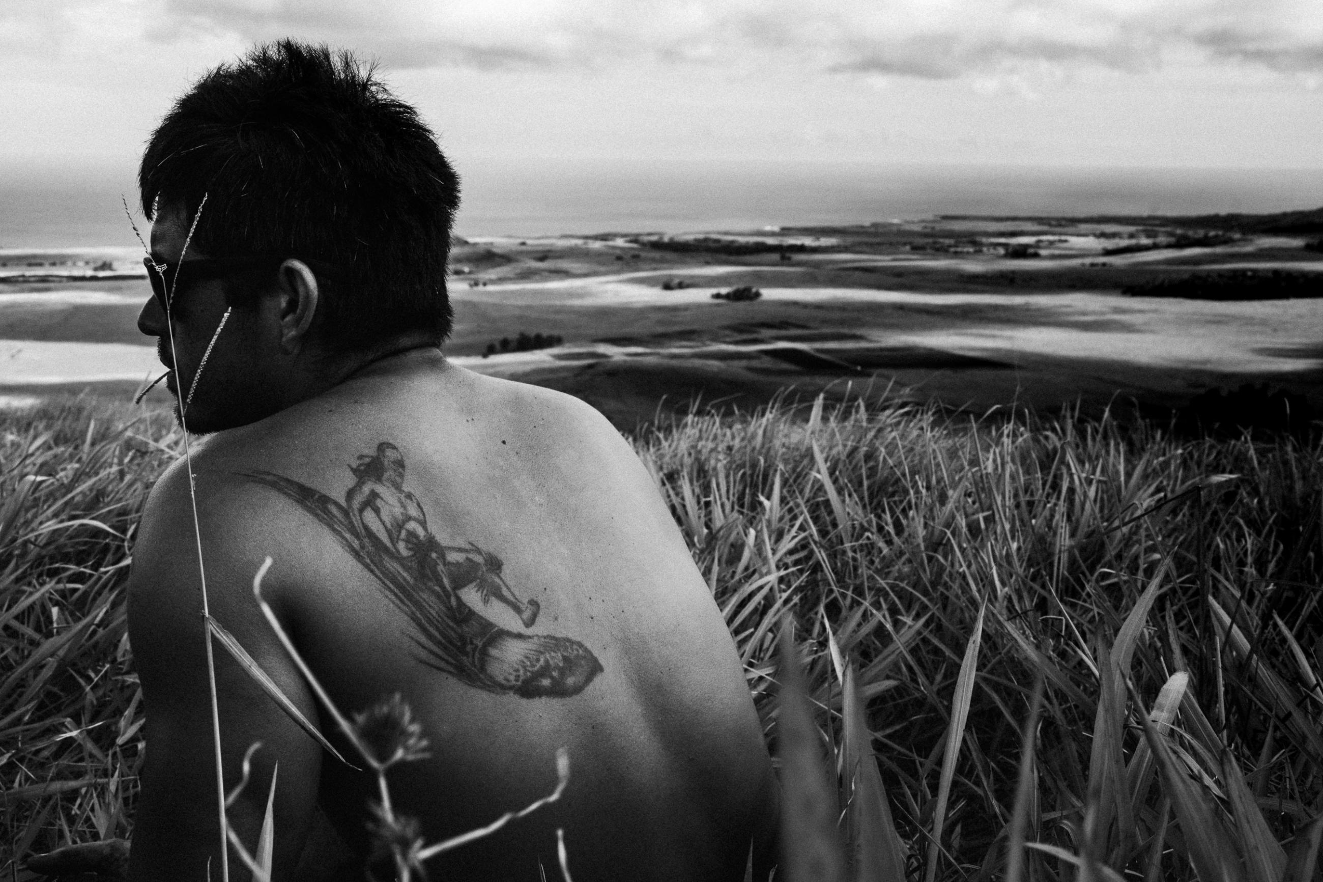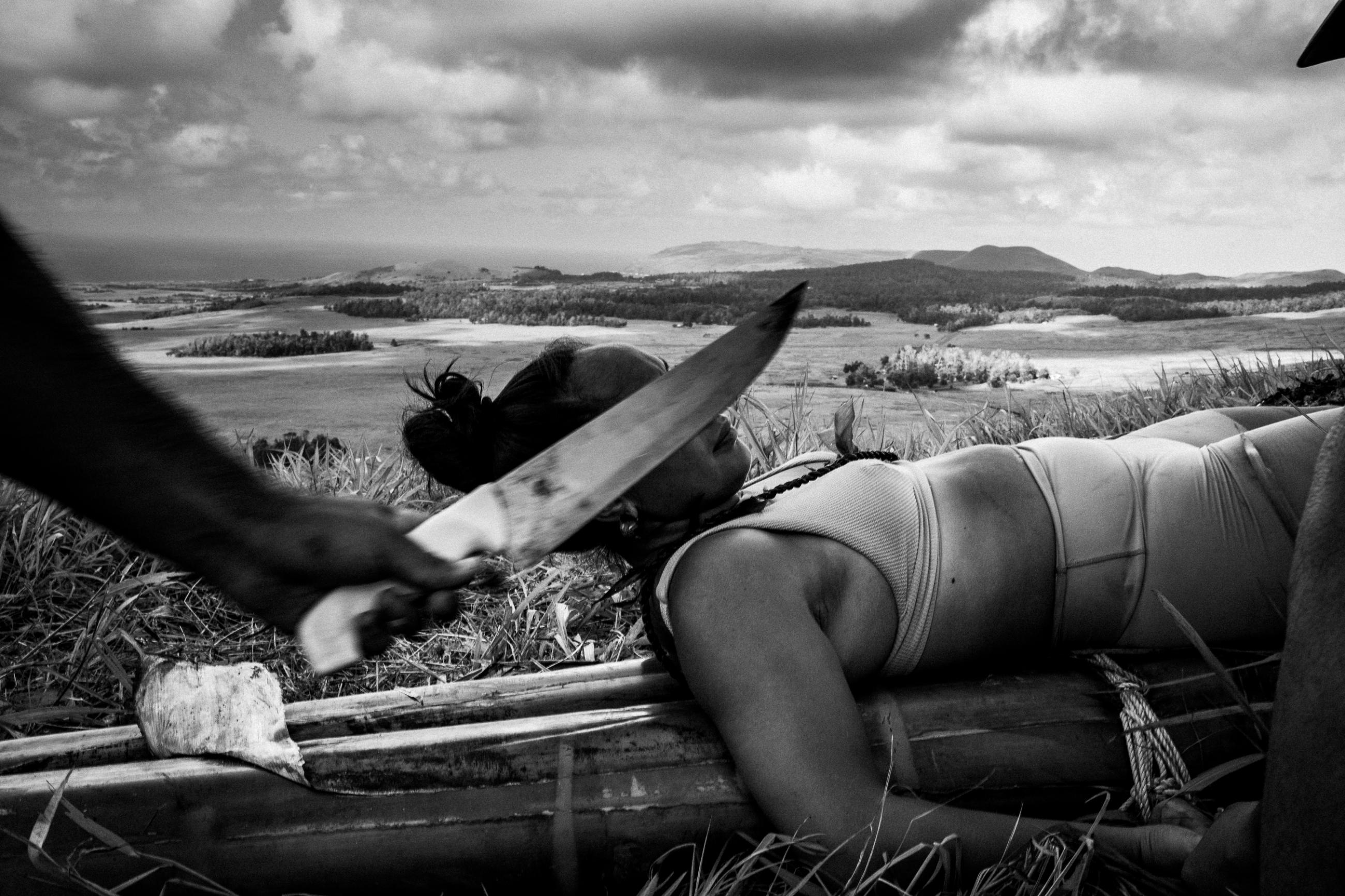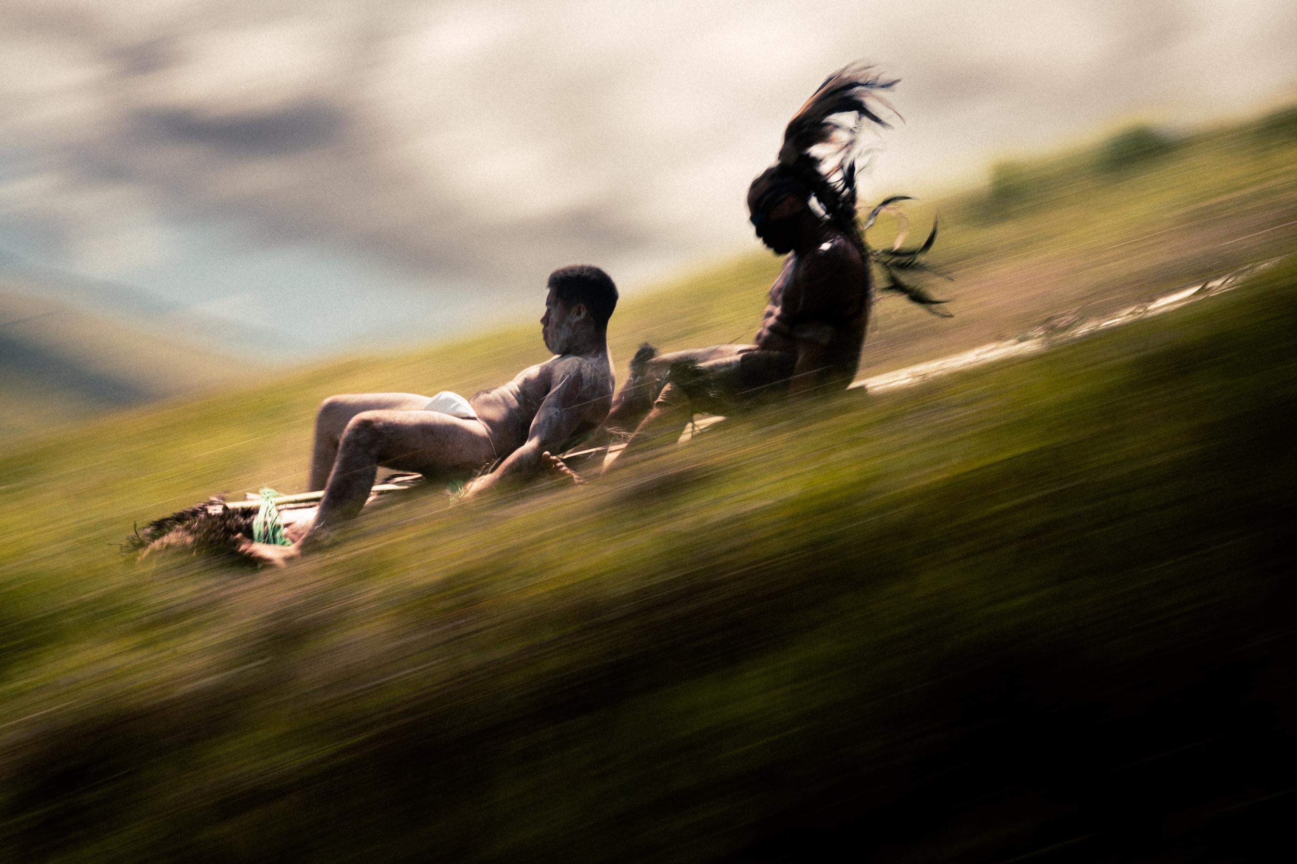 Two competitors (Rapa o Miru Pakarati in white, Tavo Mata te Pari in black) mounted on banana trees (huris) ride down Maunga Pu’i at speed. They are wearing ancestral Rapa Nui dress to honour their tupuna (ancestors).