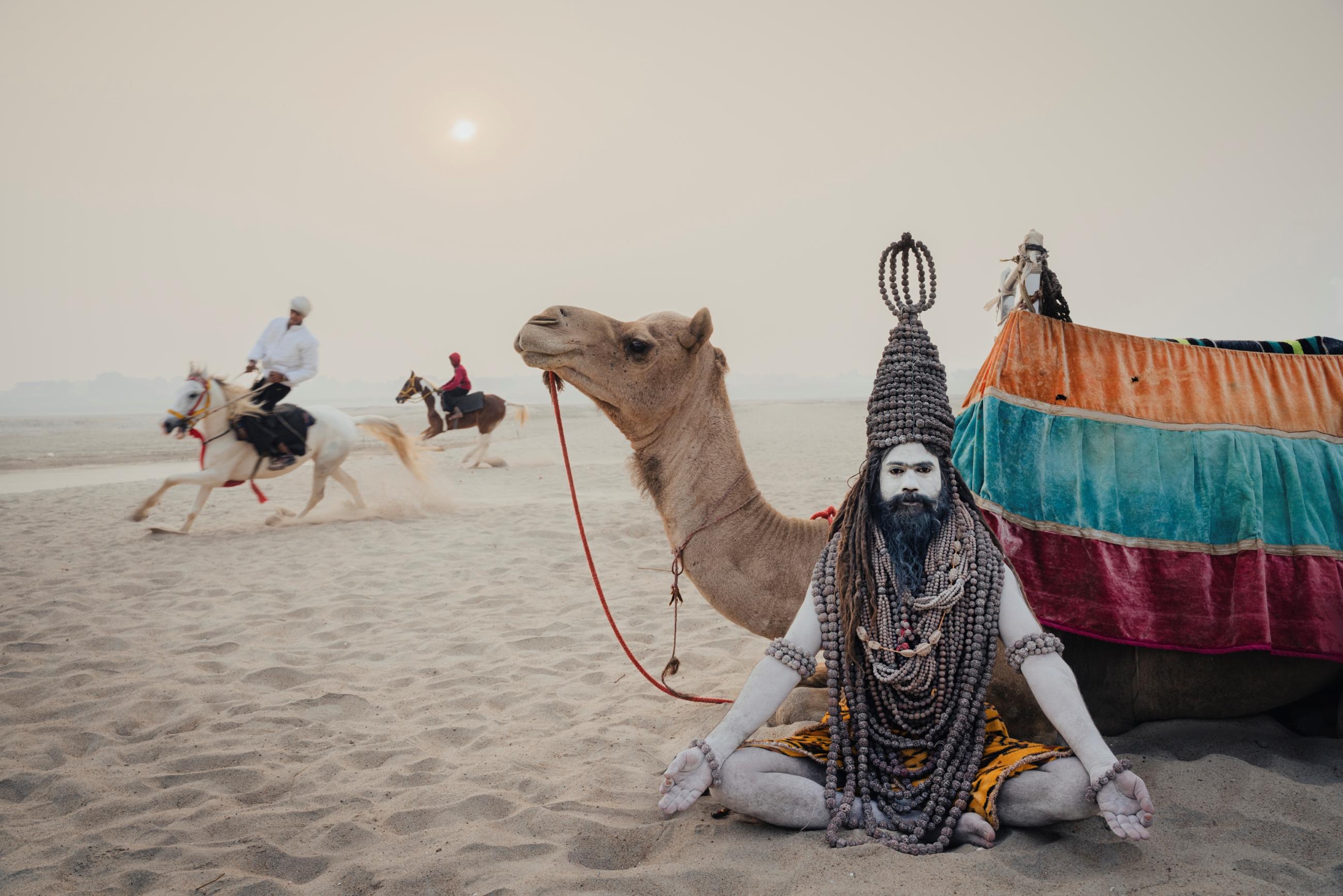 At dawn on the wide riverbed of Varanasi, India, a Baba sits cross-legged beside a resting camel, as horses thunder past across the sand. The rising sun hangs in the haze, the scene suspended between spectacle and stillness — a meeting of ceremony, performance and movement in the morning light.