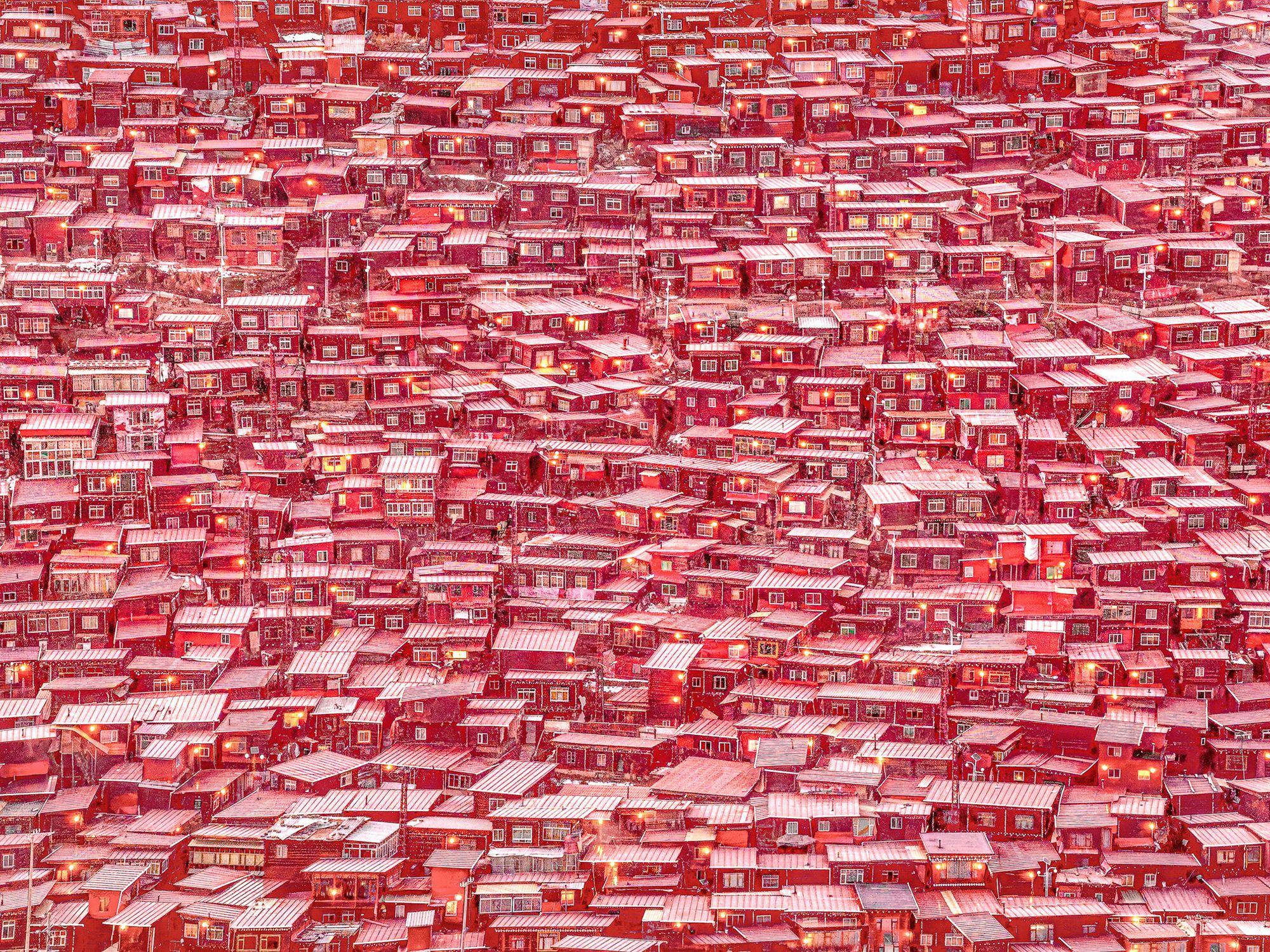 The first snow gently falls on the crimson monk quarters, contrasting with the vermilion walls. Amid the empty spaces left by red and white lies the serenity of the Buddhist realm.