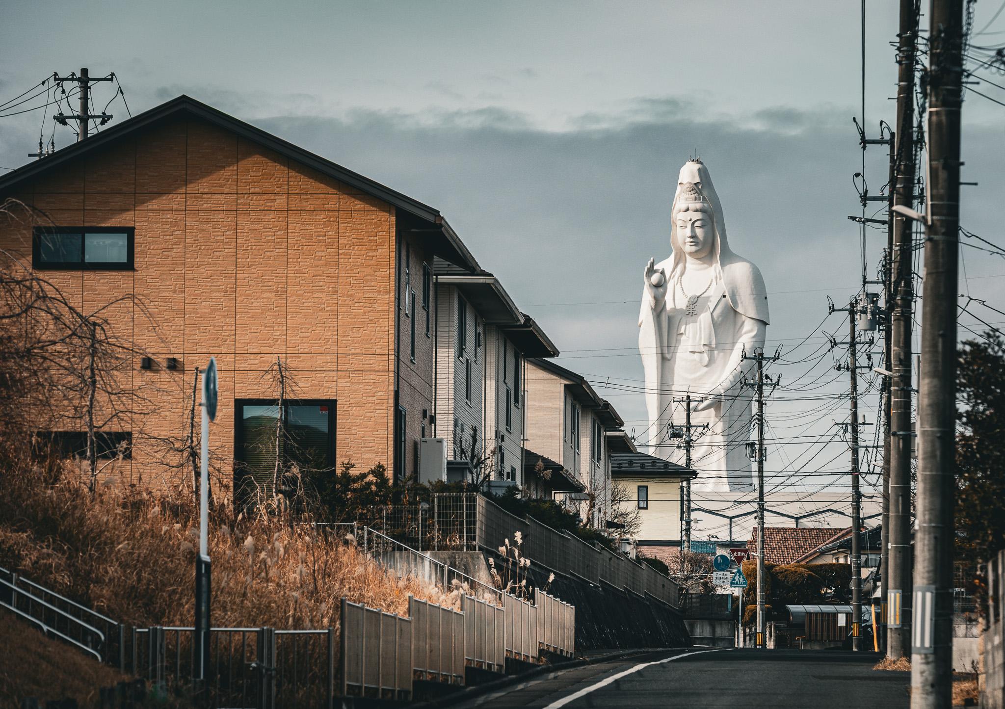 An ordinary residential street is quietly overshadowed by a monumental presence in the distance.