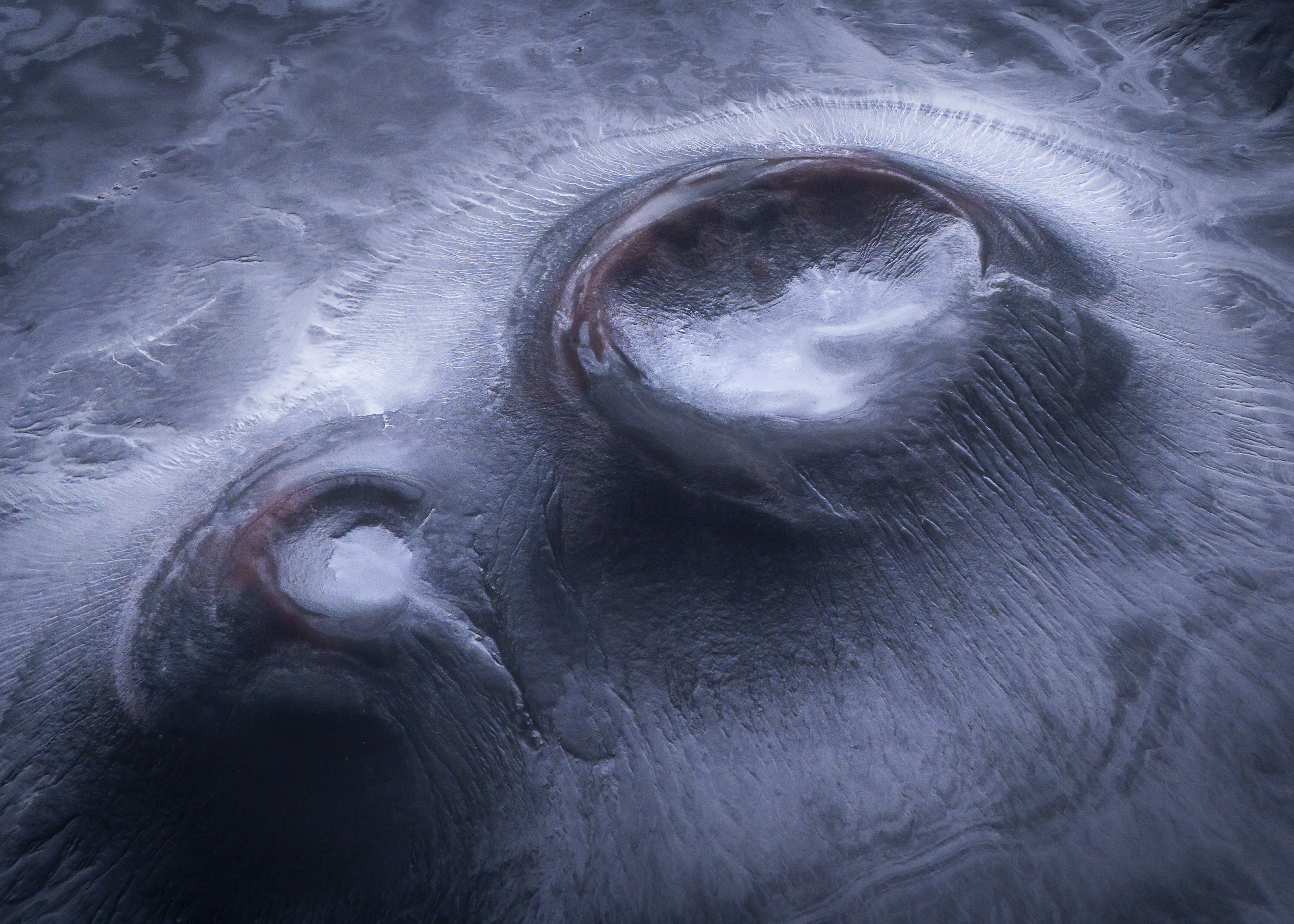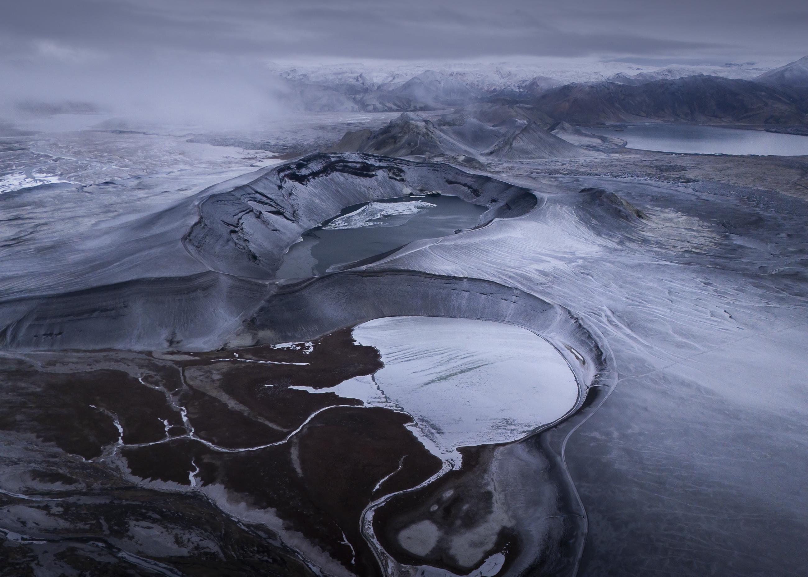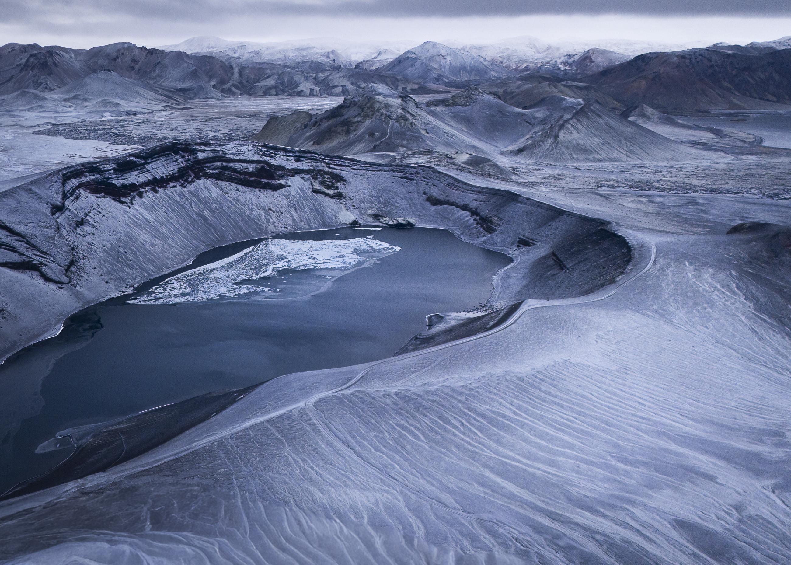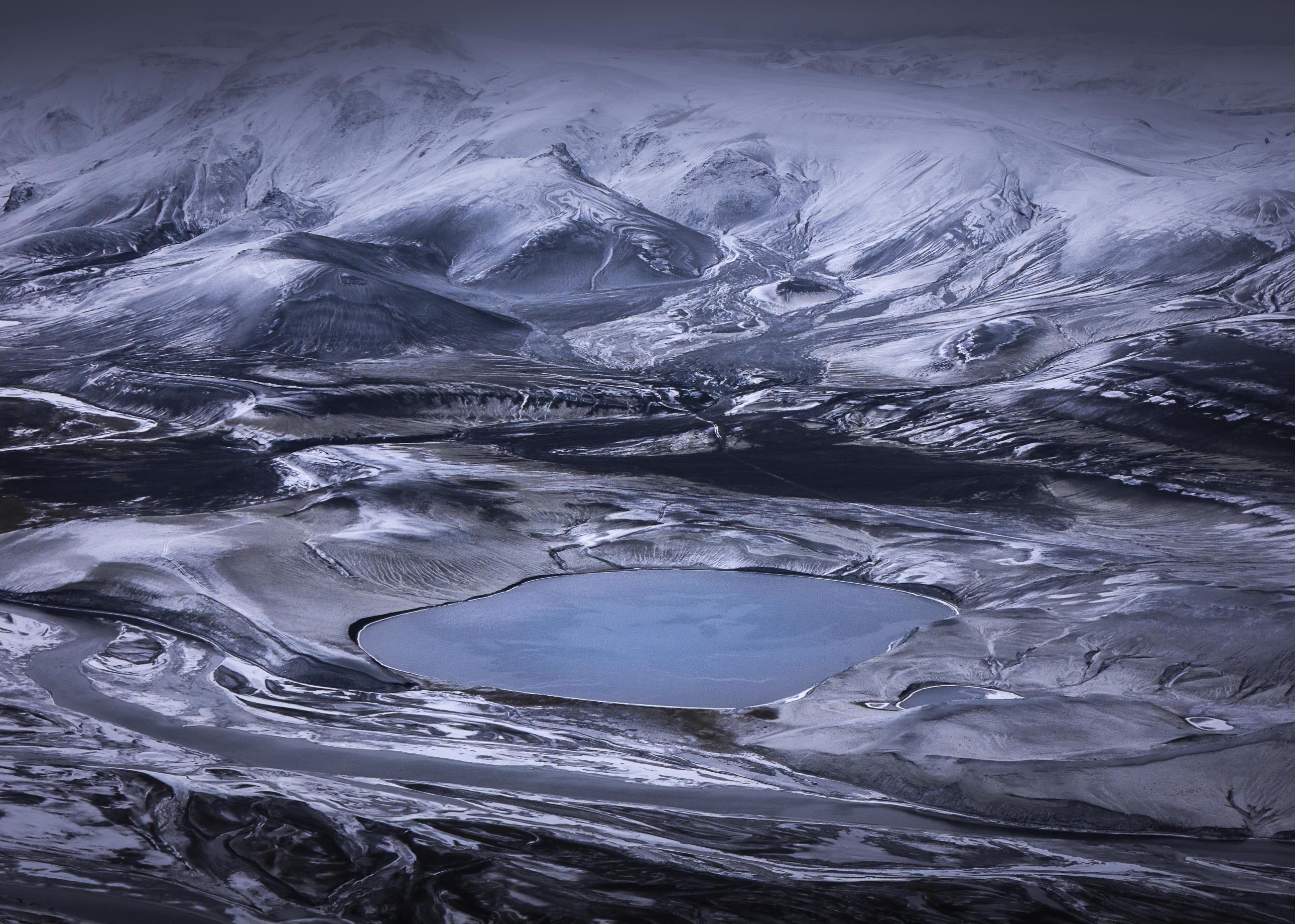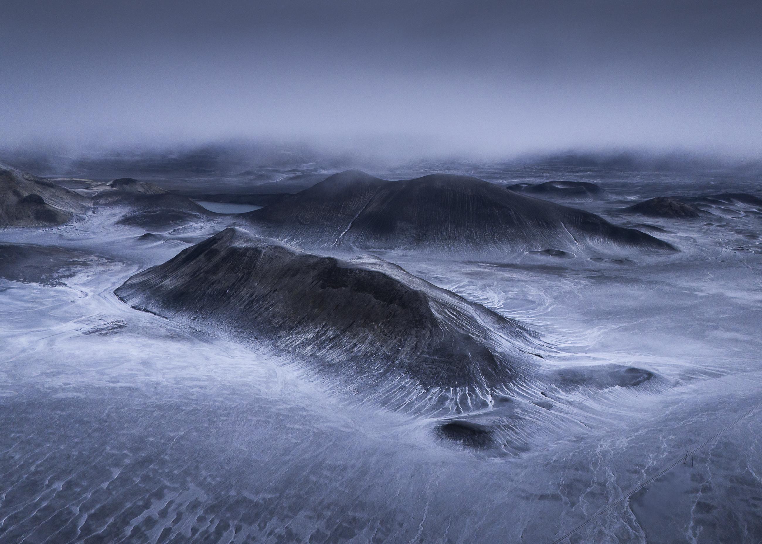 2D: Frozen World was photographed on the last day that the Icelandic Highlands were open, before heavy snowfall closed the area for the season. The images reveal the black volcanic desert covered by the first frost, which forms sharp, graphic patterns on the dark sand. The contrast flattens depth and scale, transforming the landscape into abstract, near-two-dimensional shapes, like surfaces from another planet. It is a fleeting moment between autumn and winter, frozen in time.