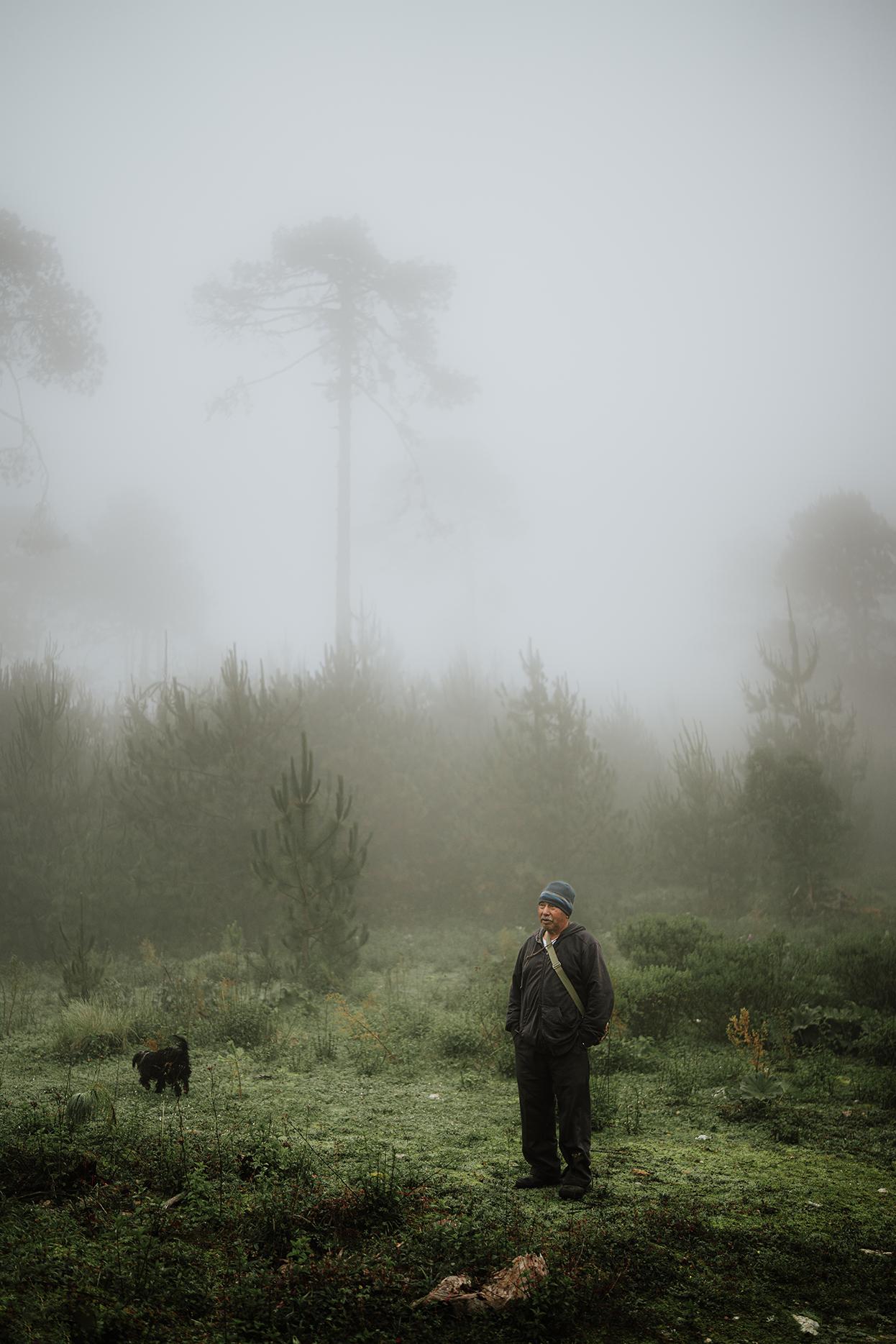 Don Tobias, mountain guide, stands still as fog surrounds him. He waits patiently for the clouds to open and reveal the path ahead, in an image that reflects knowledge, time and trust in the rhythm of the land.
