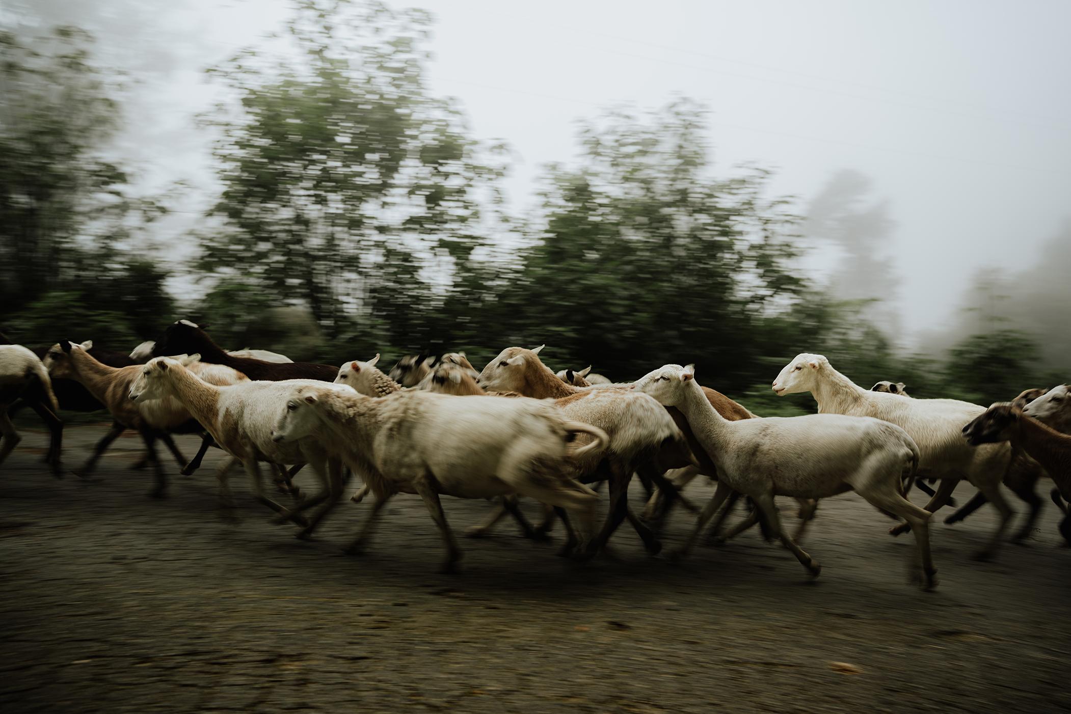 Sheep move along a mountain road, motion blur emphasising their speed as the distant trees fade into the mist. This photograph captures the constant journey between pasture and shelter.