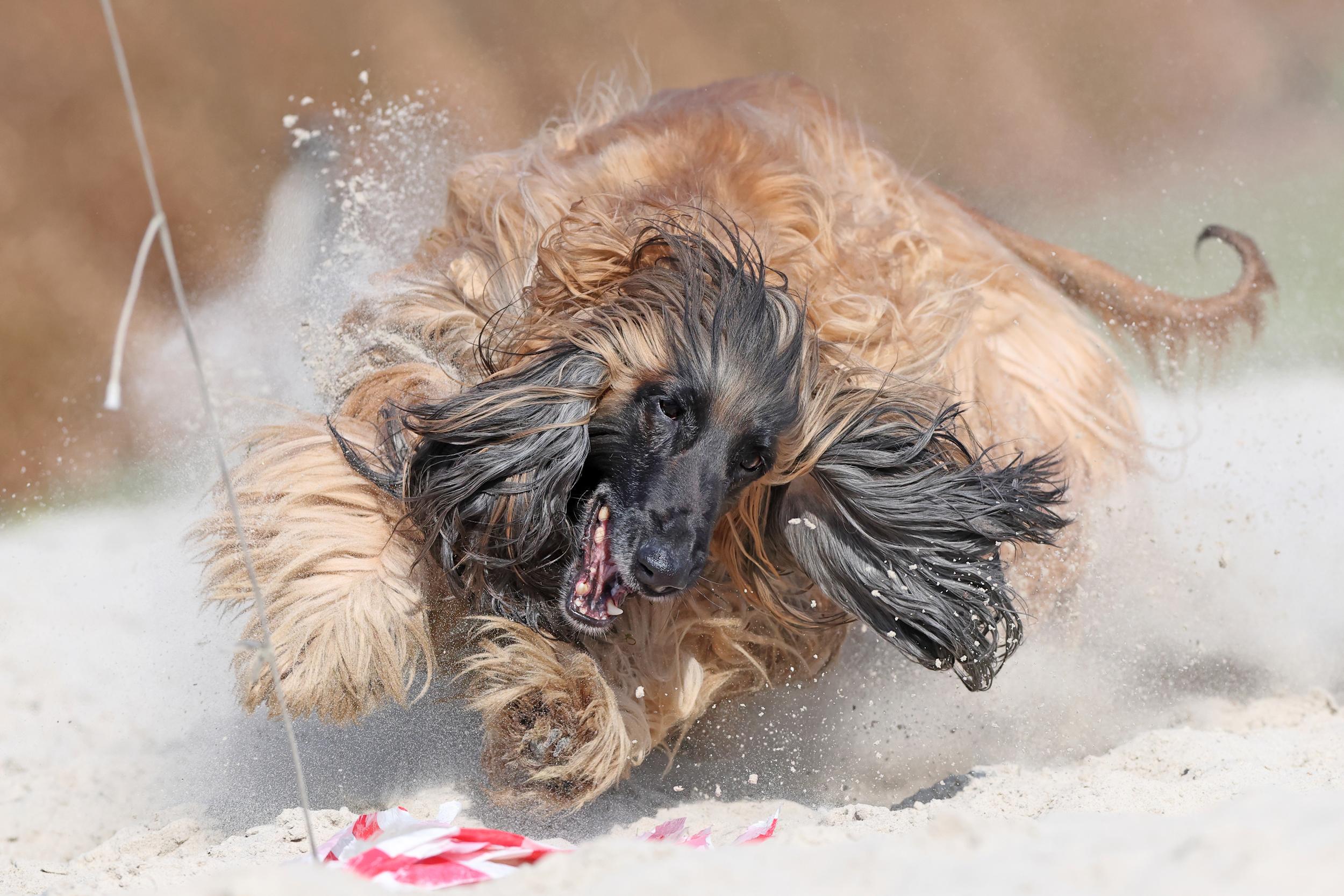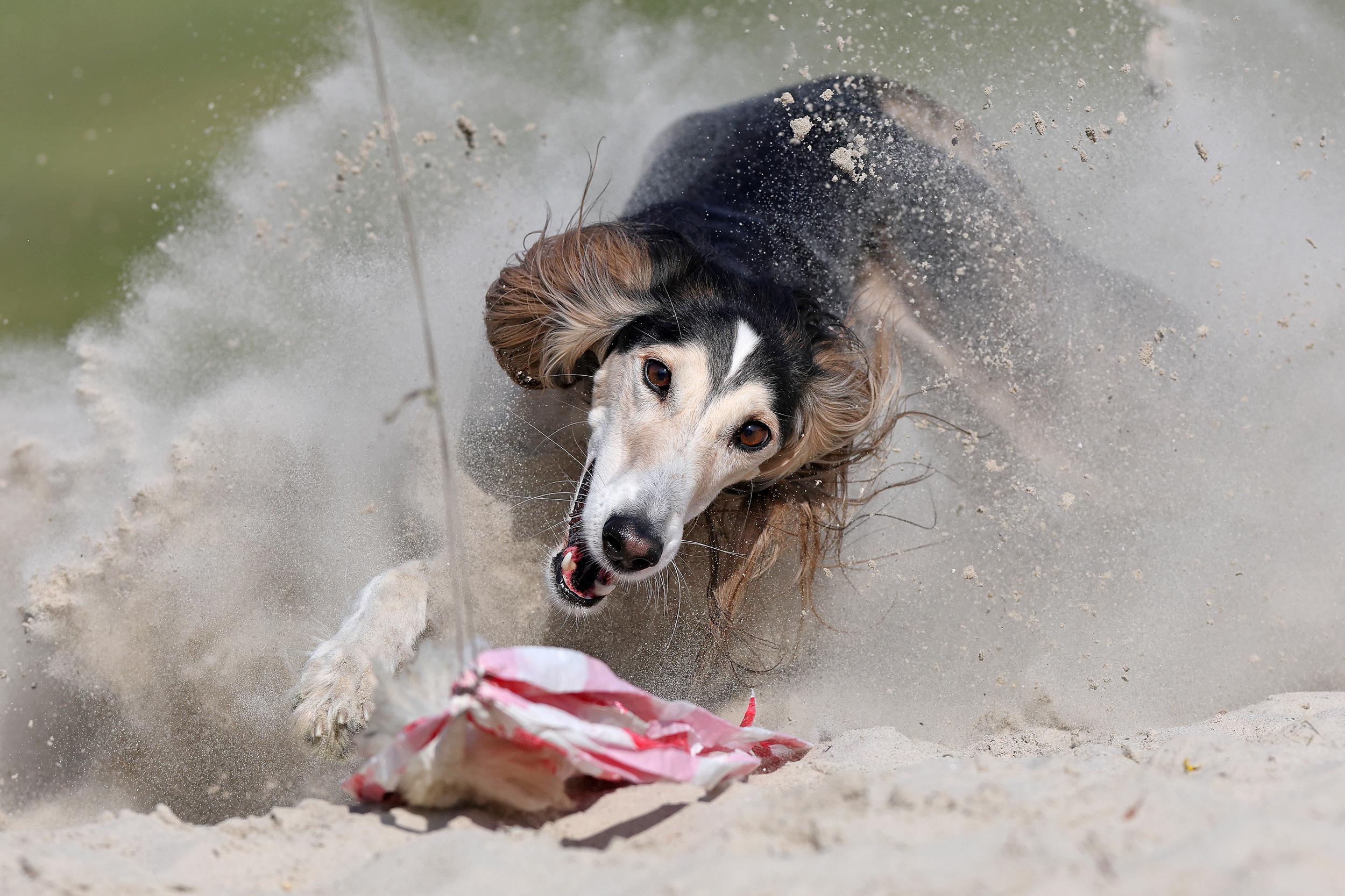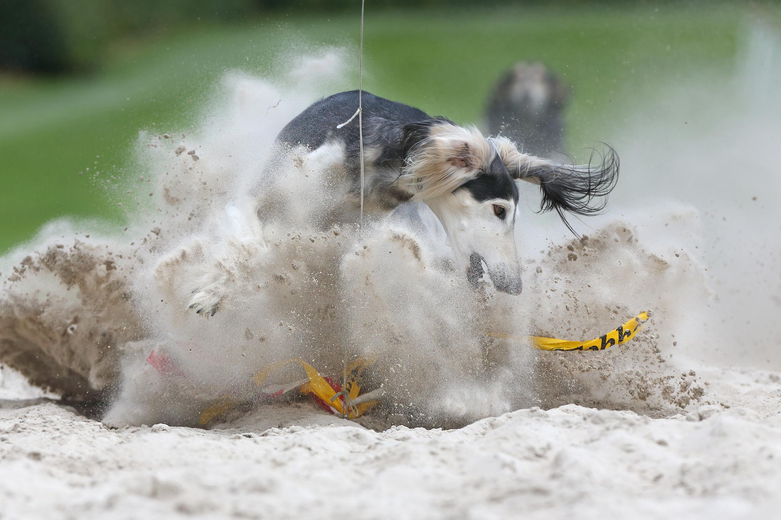 For many years the photographer has attended sighthound training sessions. Many of the sighthounds are former racing dogs that have been adopted by private owners and families in order to give them a happy post-racing life. However, even after retirement they are still athletes that need to run and chase on a daily basis. At this private track, an artificial rabbit is pulled by wire along the track, allowing the dogs to run alone or in small groups. At the end of the track there is a soft sandbox where they can grab the fake rabbit — this is the photographer’s favourite moment to photograph these magnificent and gentle creatures.