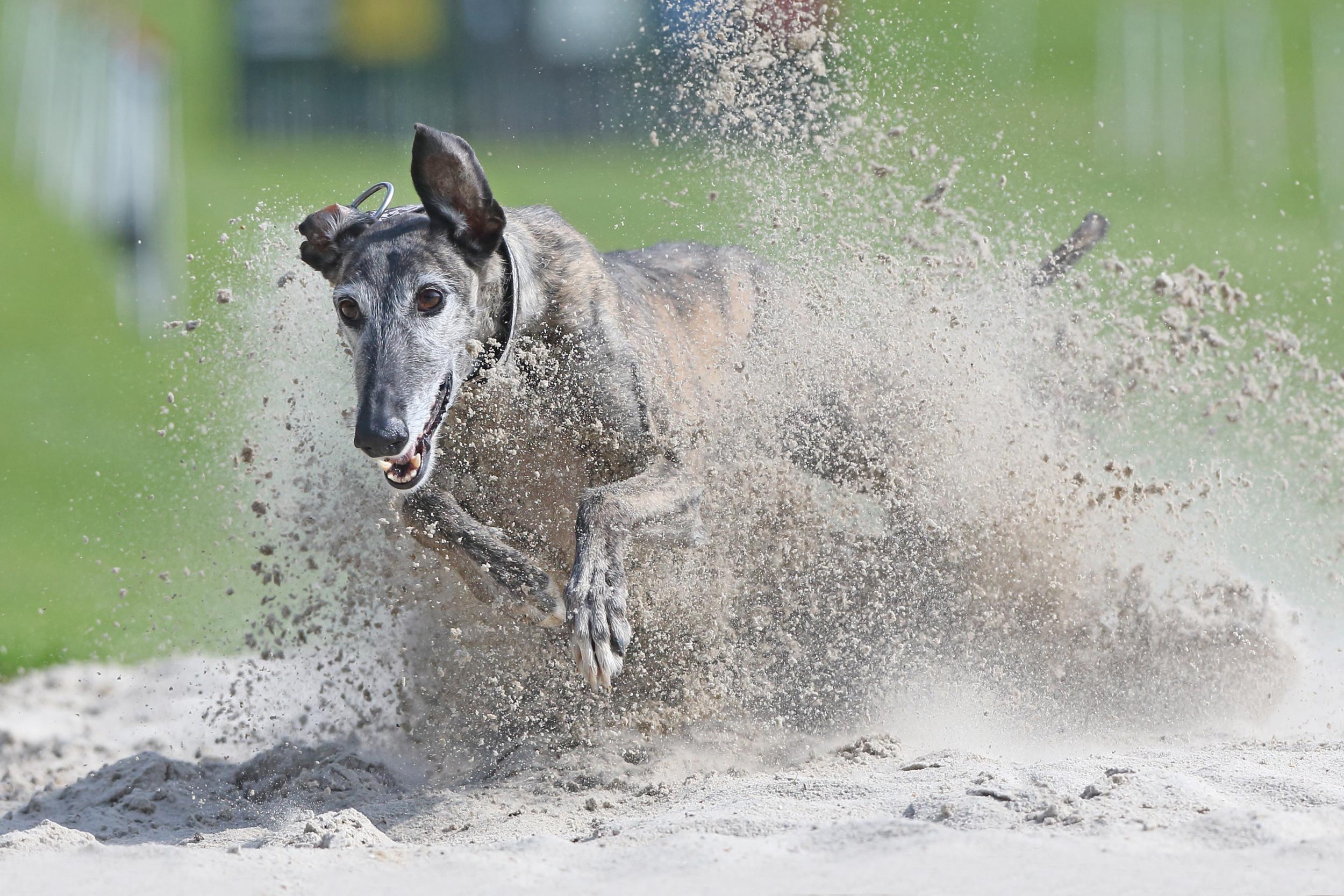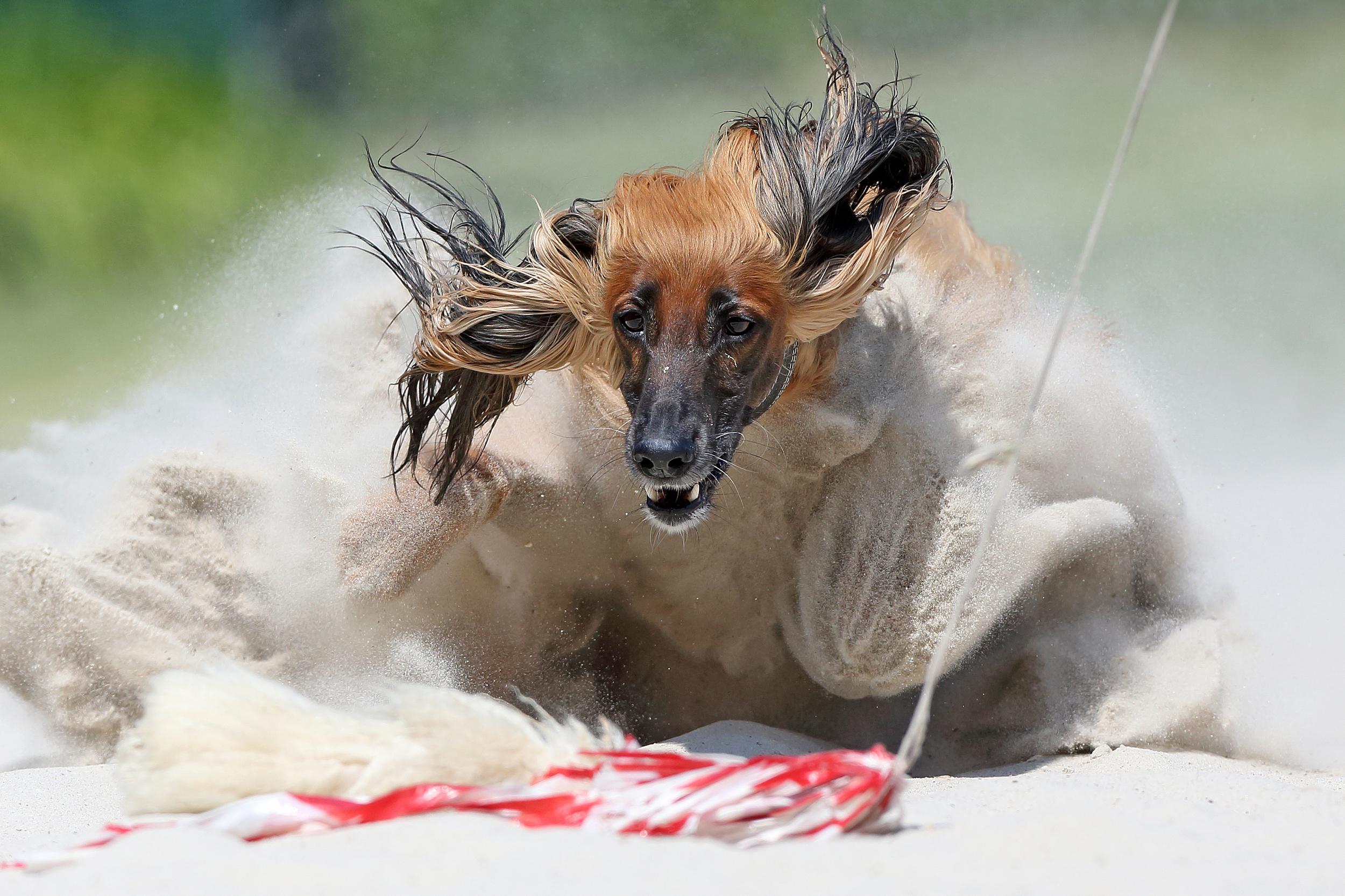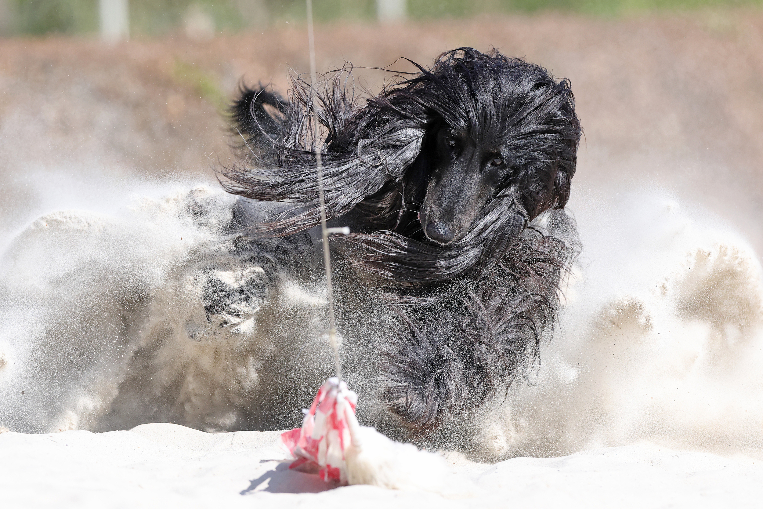 For many years the photographer has attended sighthound training sessions. Many of the sighthounds are former racing dogs that have been adopted by private owners and families in order to give them a happy post-racing life. However, even after retirement they are still athletes that need to run and chase on a daily basis. At this private track, an artificial rabbit is pulled by wire along the track, allowing the dogs to run alone or in small groups. At the end of the track there is a soft sandbox where they can grab the fake rabbit — this is the photographer’s favourite moment to photograph these magnificent and gentle creatures.