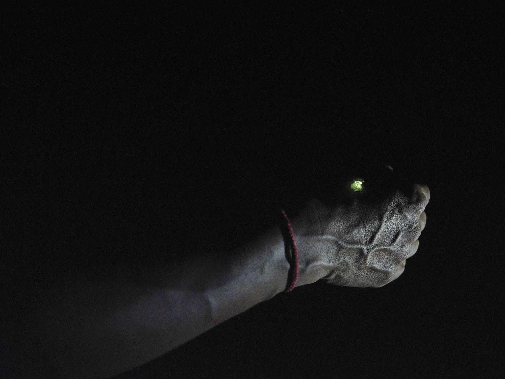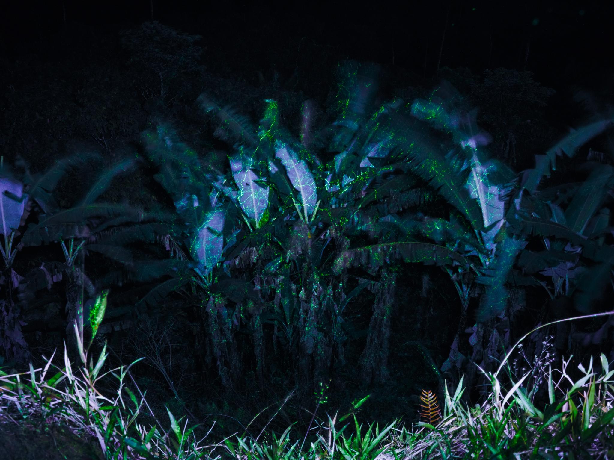 This 8-minute light-painting, made in collaboration with Ailin Blasco, was taken using ultraviolet light. It was inspired by conversations with scientists about speculative ways in which certain non-human species perceive their surroundings and human presence. In this humid tropical forest of Ecuador’s Chocó region, ultraviolet light reveals contrasts invisible to the human eye. Several species, including birds, are able to perceive this spectrum.
