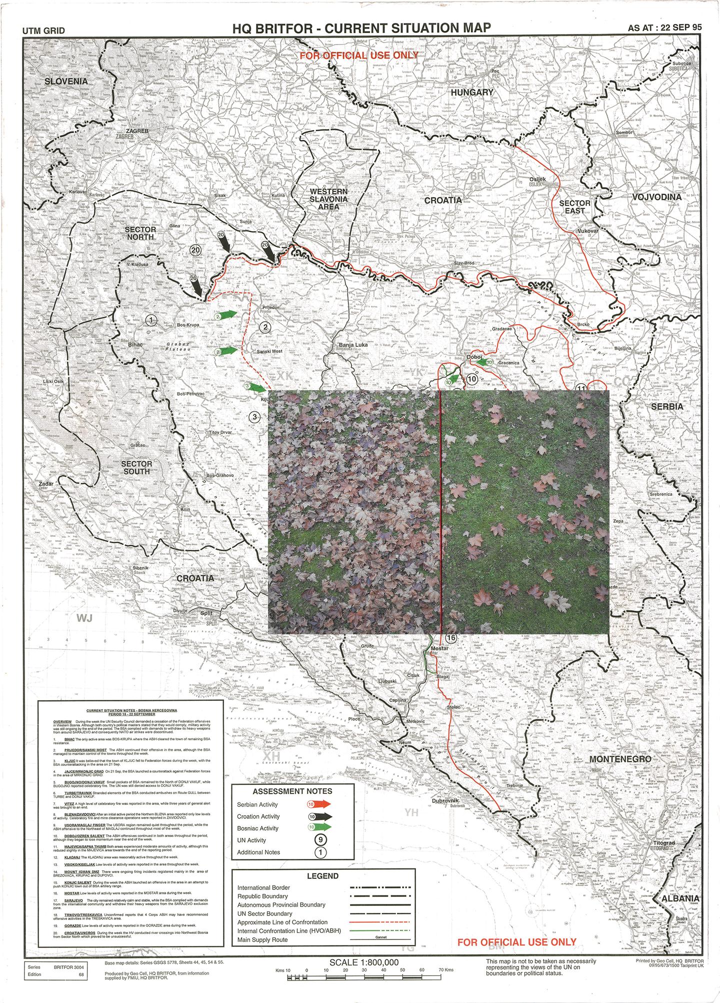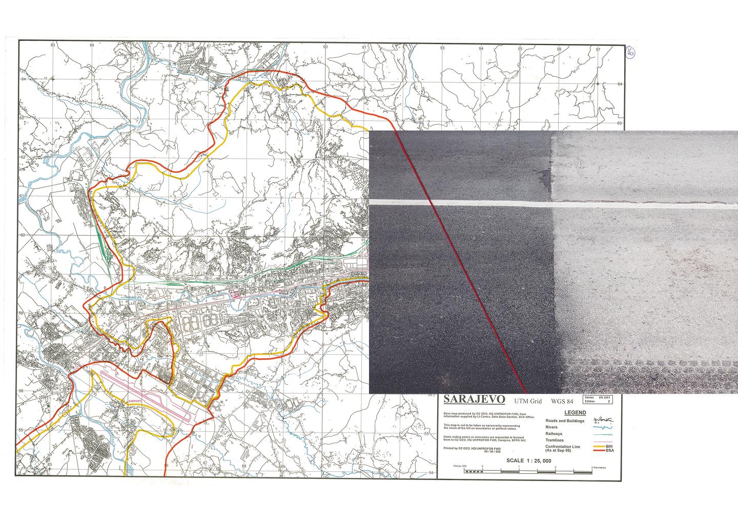 Left: Abandoned trenches at Zlatište, on the outskirts of Sarajevo, are a lasting reminder of the makeshift shelters created by defenders of the city. During the war, civilians turned soldiers dug the trenches. Right: A UN map titled Faction Dispositions — Sarajevo, April 1995 shows faction boundaries, buffer zones, and demilitarised areas in the city during the final months of the Bosnian War.