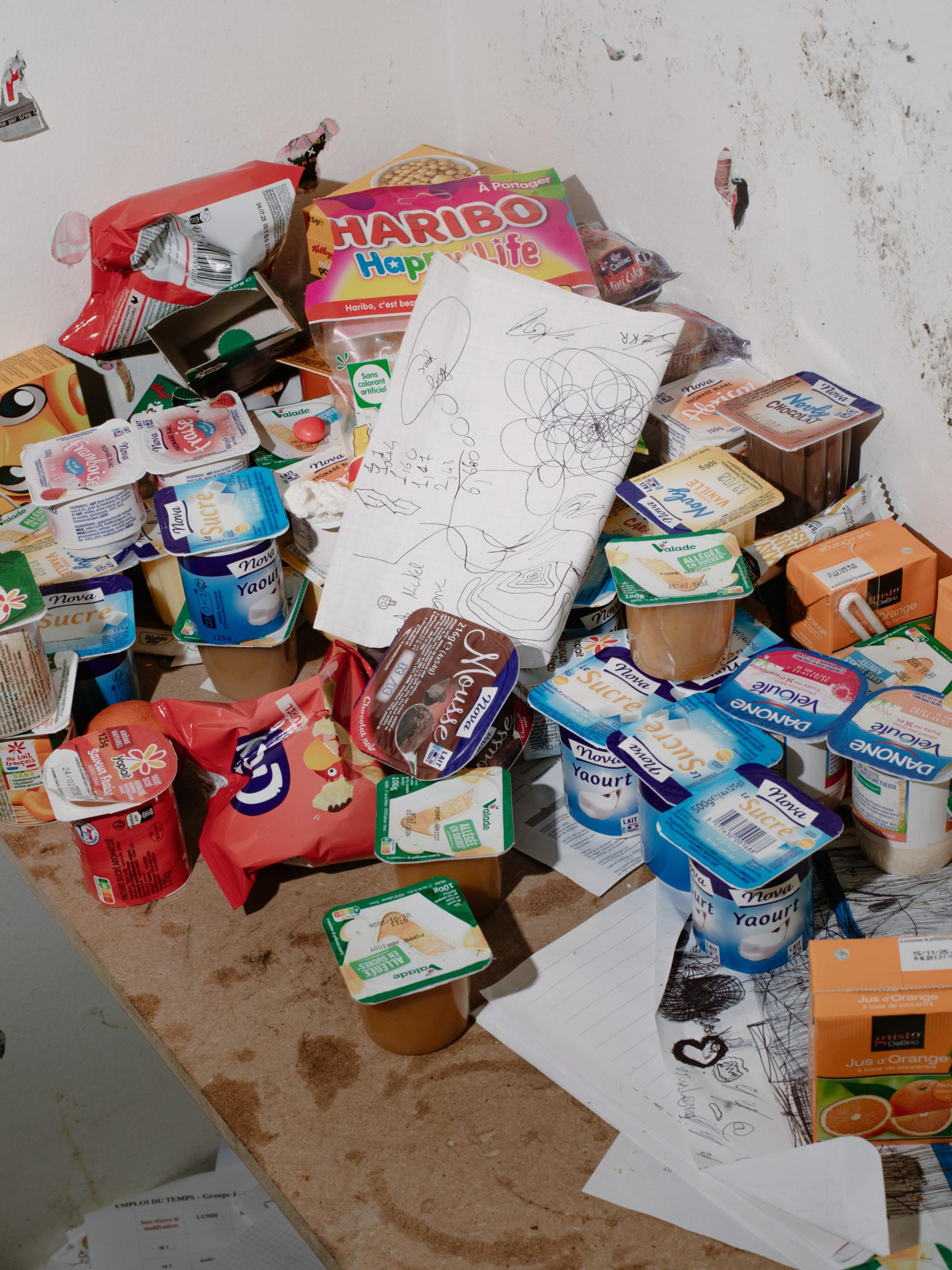 Yoghurt and apple sauce cups pile up in a cell. Recently arrived, this detainee kept them for a while to count the days since his incarceration: one yoghurt per day.
