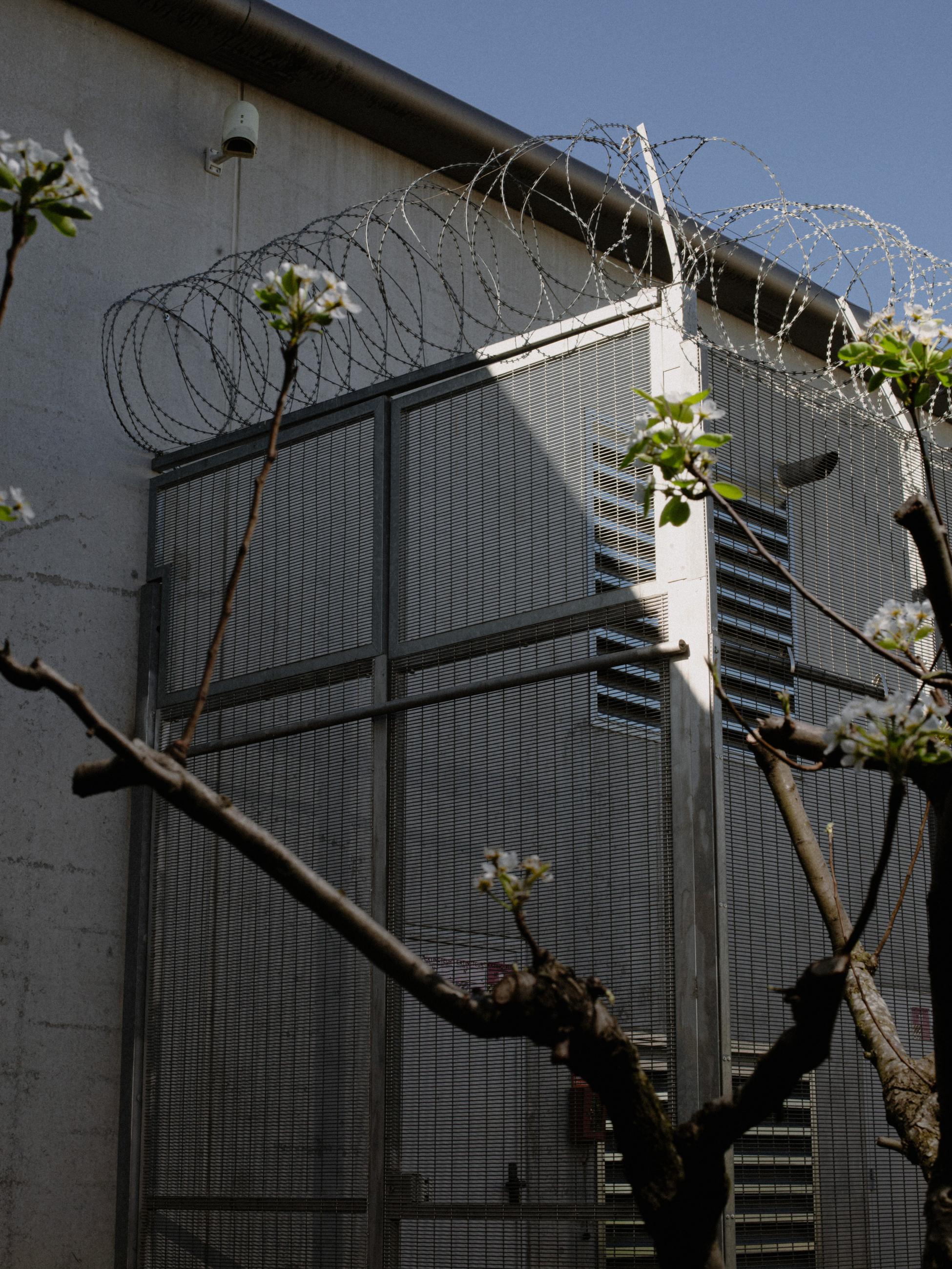 A young person slips his hand between the grates and bars of his cell, using a piece of broken mirror to watch the outdoor yard.