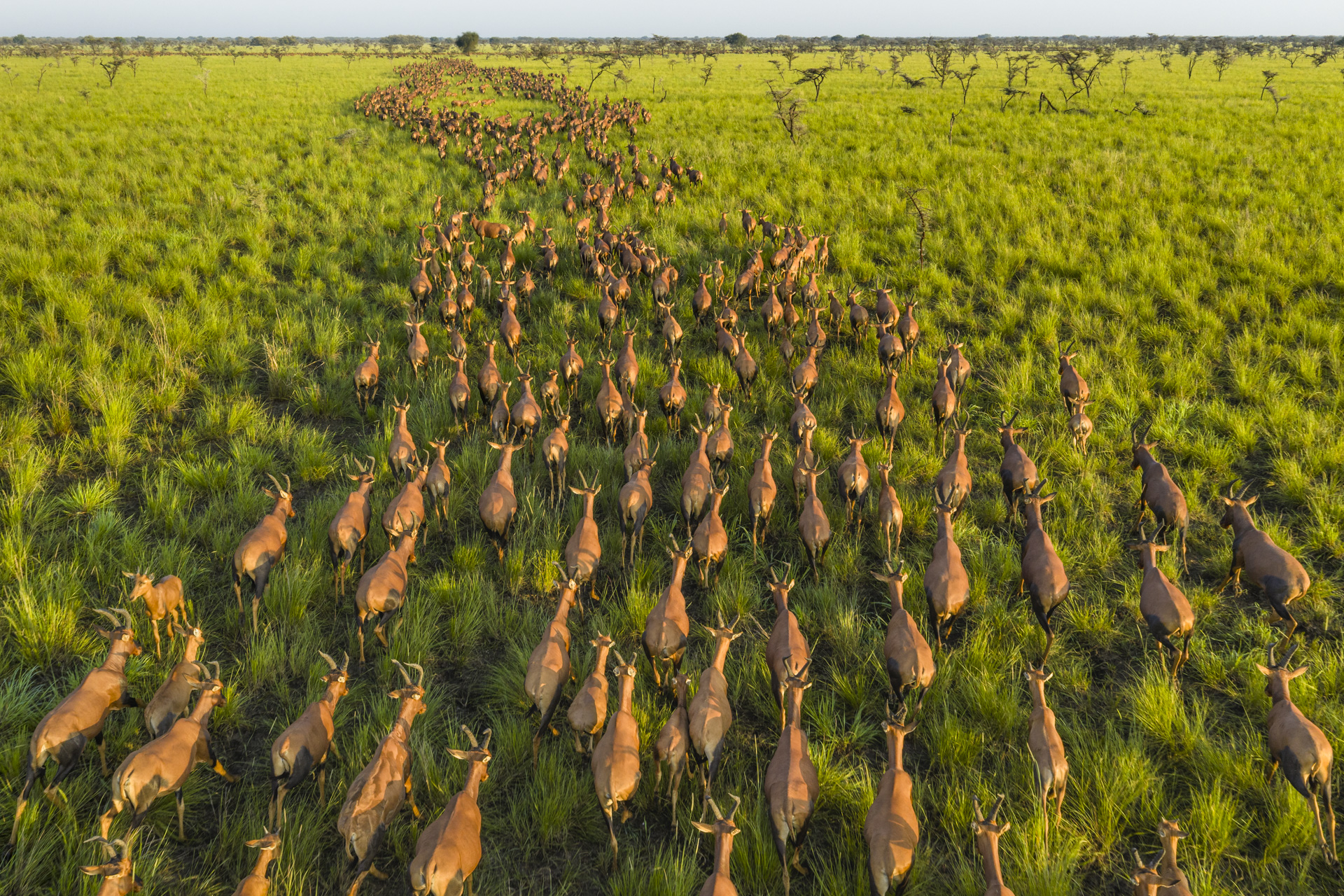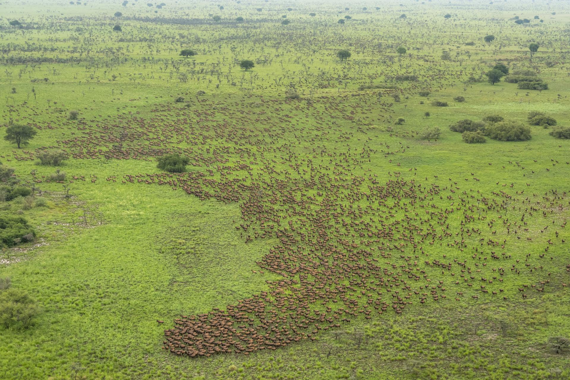 Part of the Great Nile Migration, half a million tiang (Damaliscus lunatus tiang) move across the vast landscape of South Sudan in tightly packed herds, following the availability of water and fresh grass.