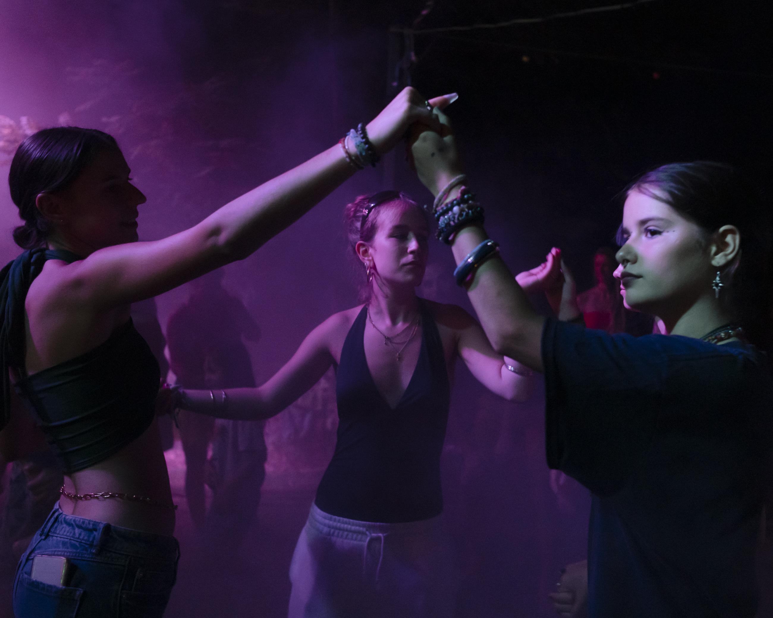 Lisa (17), Émilie (16), and Isaure (17) dancing at a party at a rencontre in Saint-Julien-de-la-Nef, Cévennes. The gatherings move to a different location each year and never take place in the same region or city twice.