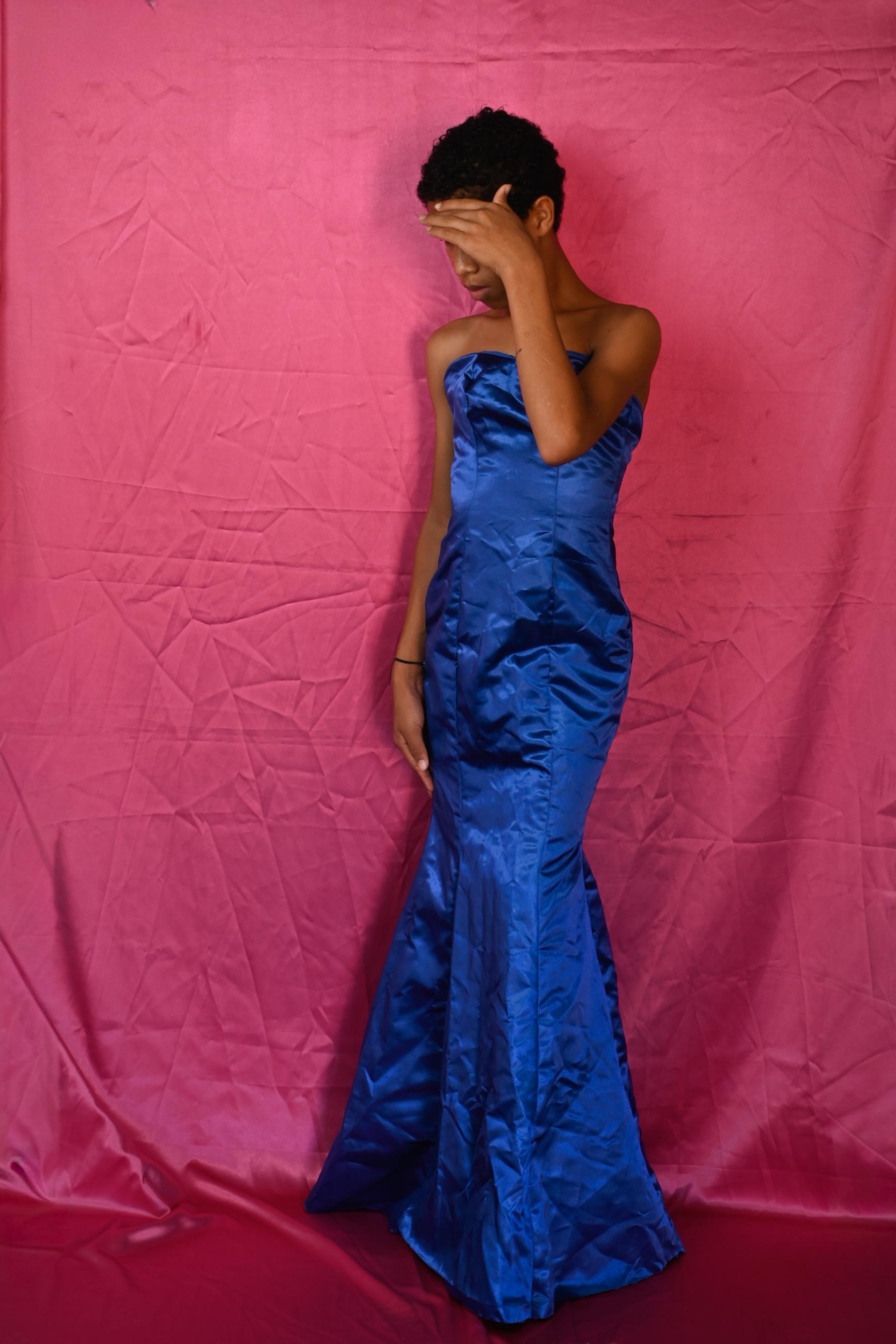 A portrait of a young person wearing a long blue dress, posing against a pink fabric backdrop. The photographer explains that partially covering their face introduces a tension between visibility and protection, while the choice of clothing challenges the gender norms associated with this region.