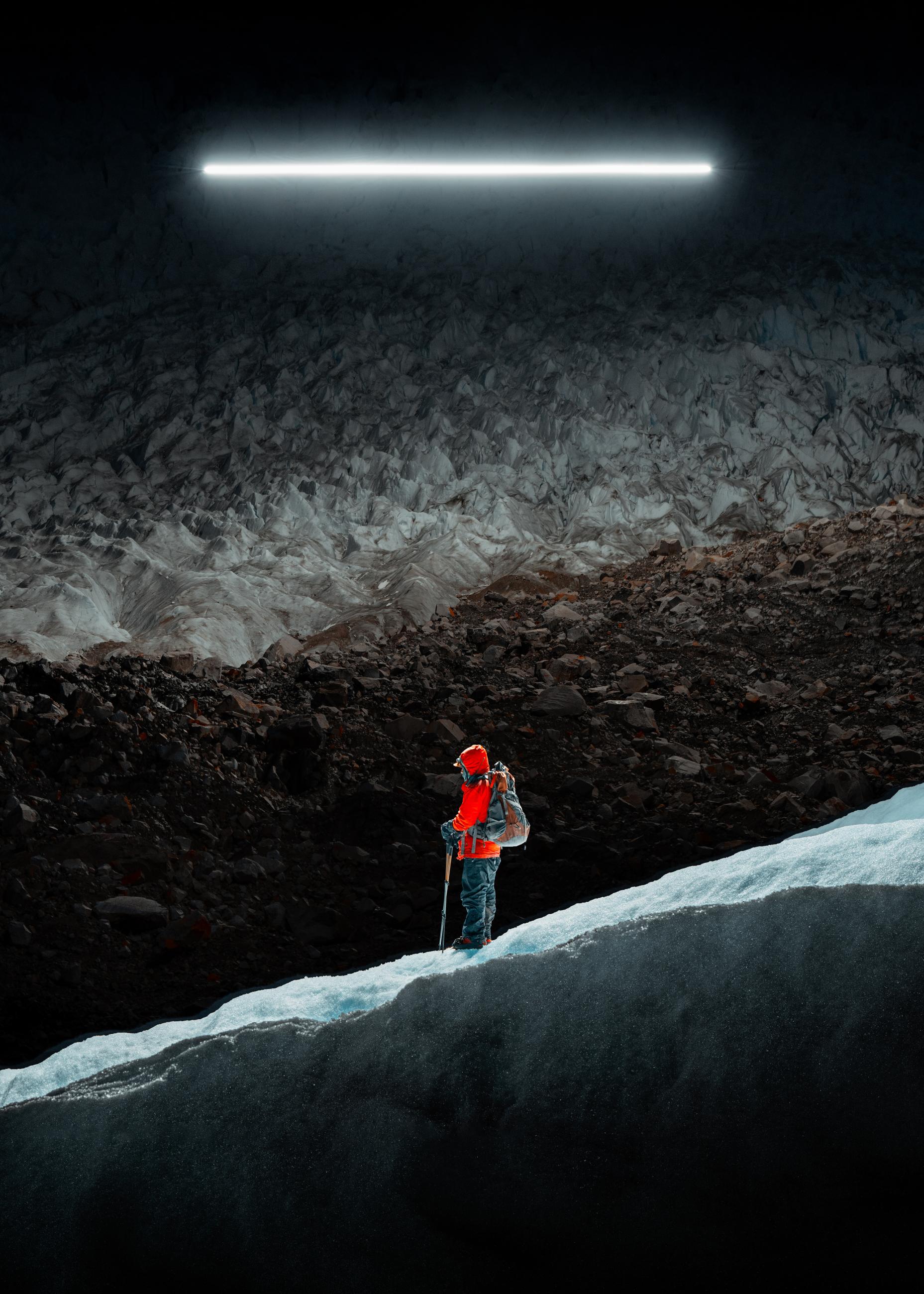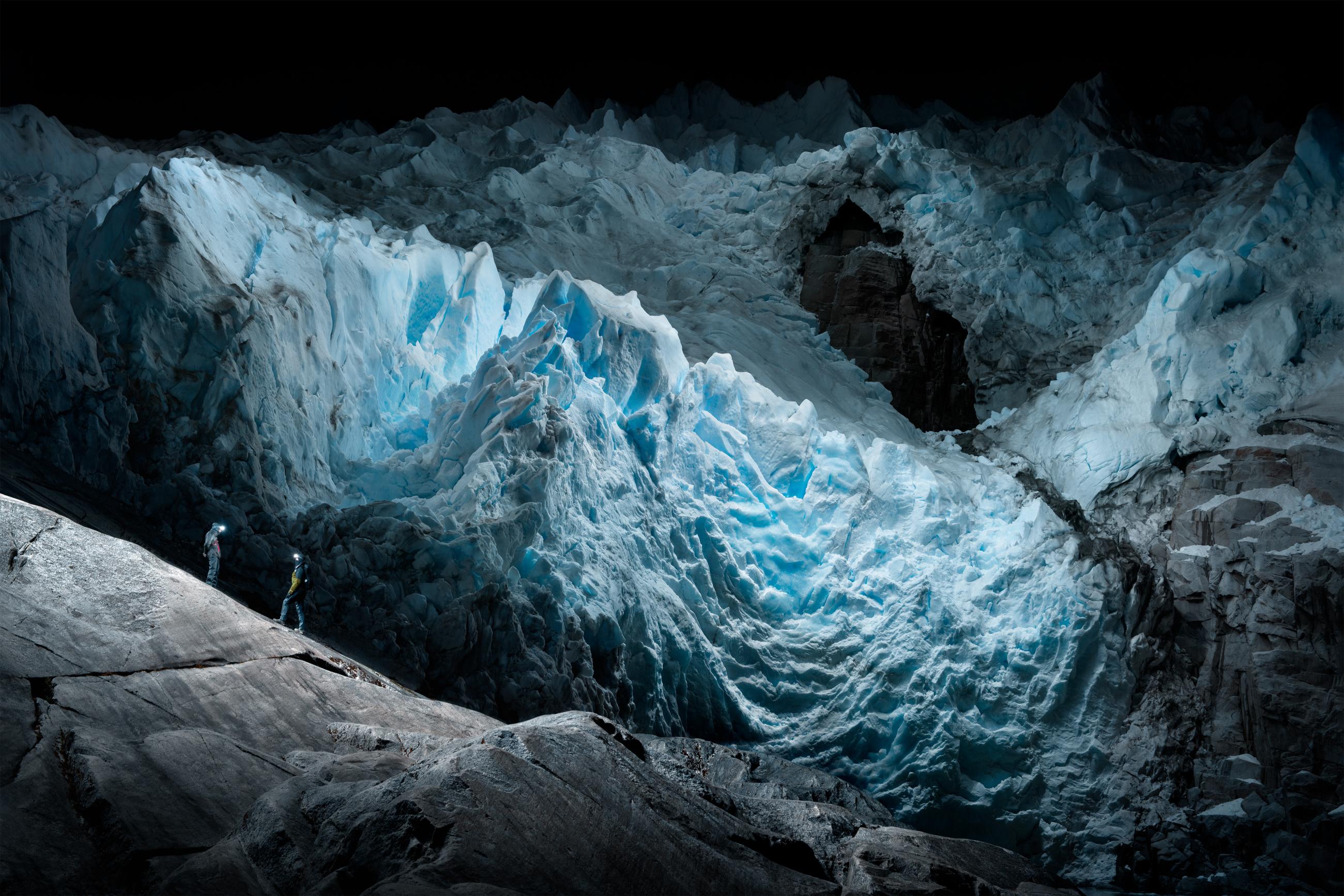 Aerial lights trace the glacier's surface level as it was in 2021, revealing how it has receded since then. In this location the photographer explains that 40 metres of thickness have been lost in four years, leaving a bare cliff face and a field of rubble. Three local ice guides sit on the side of the remaining ice, discussing the change in the landscape.
