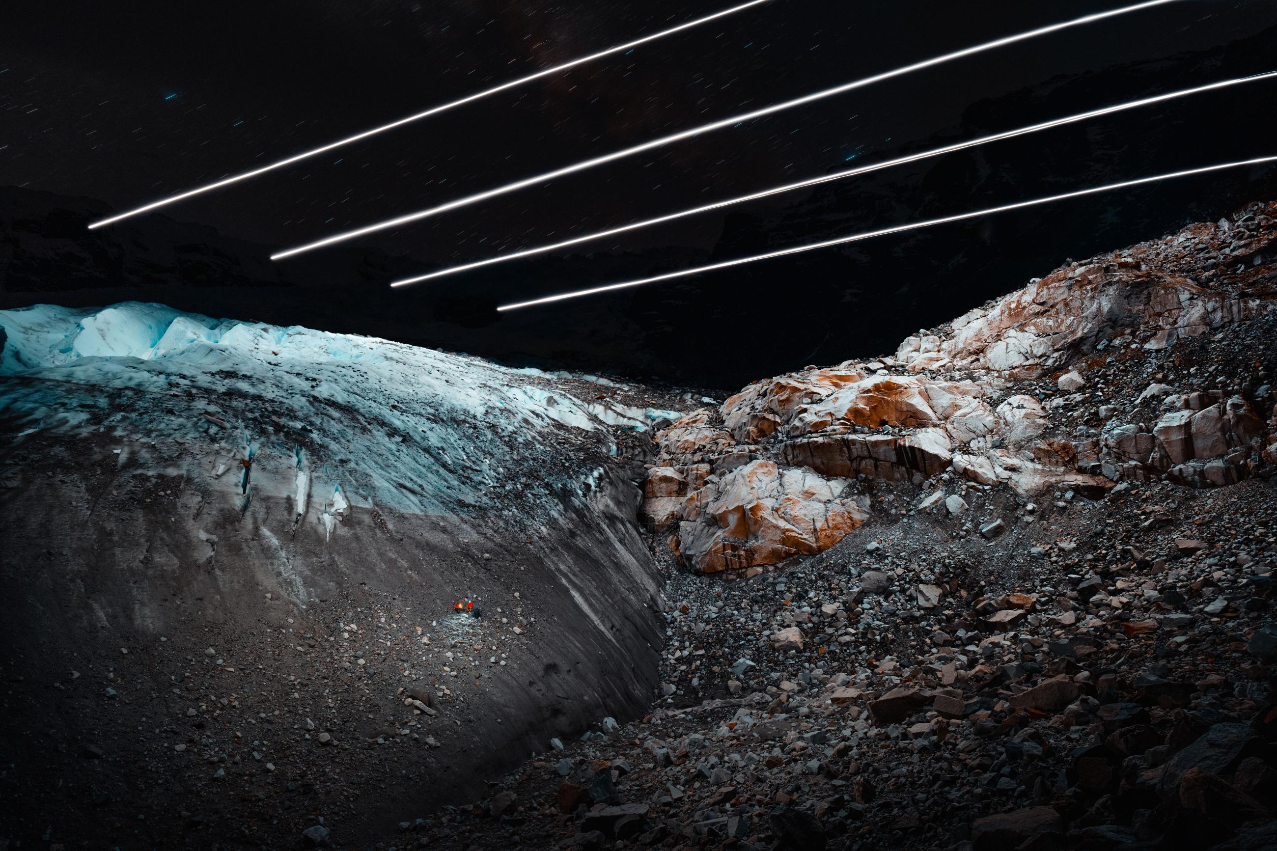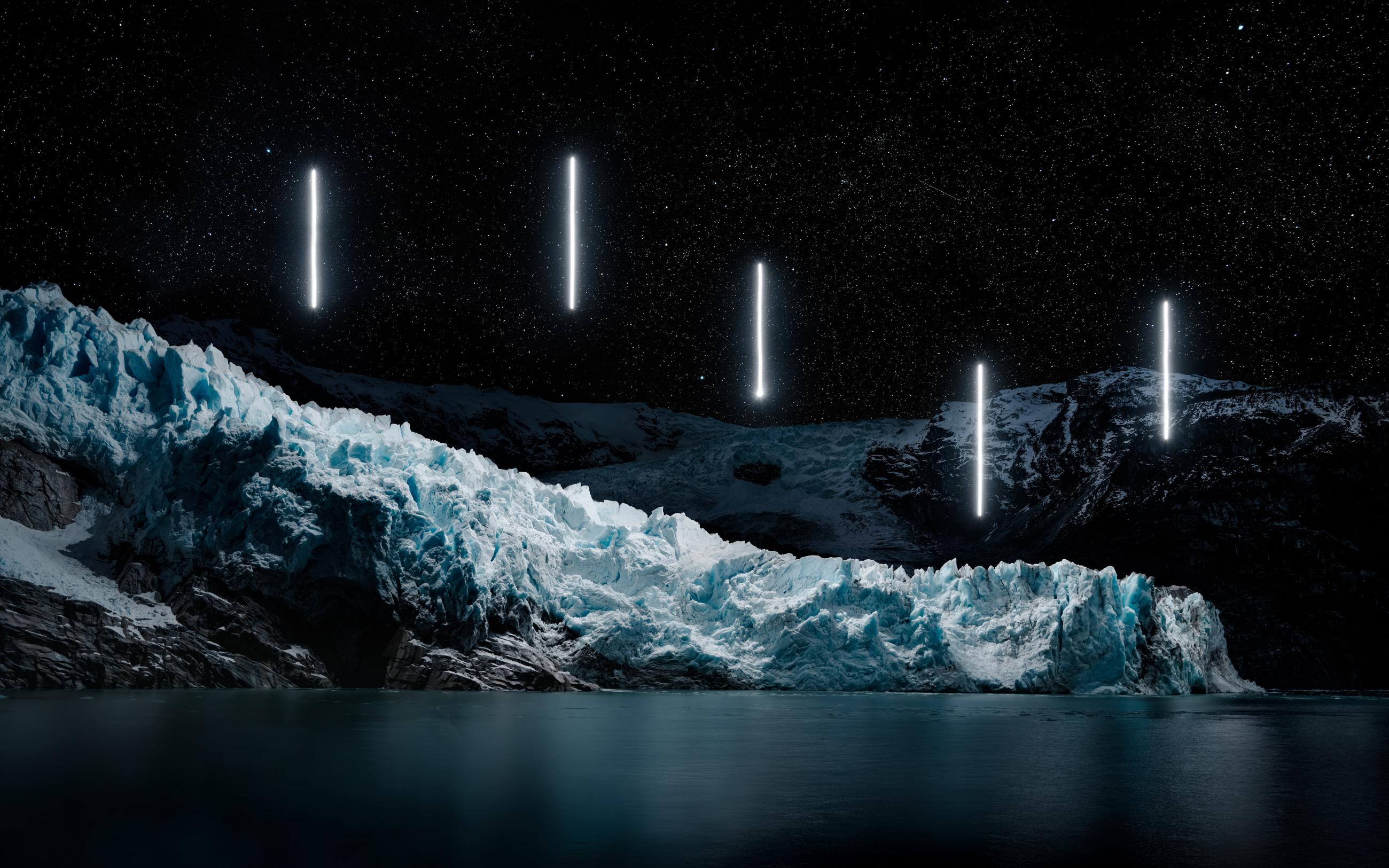Lines of light are drawn above the Leones Glacier with aerial lighting rigs, indicating the former height of the glacier. With reportedly up to half of global glacier volume projected to be lost by 2100, it is unknown what will remain if the Leones Glacier continues to decline at its current rate.