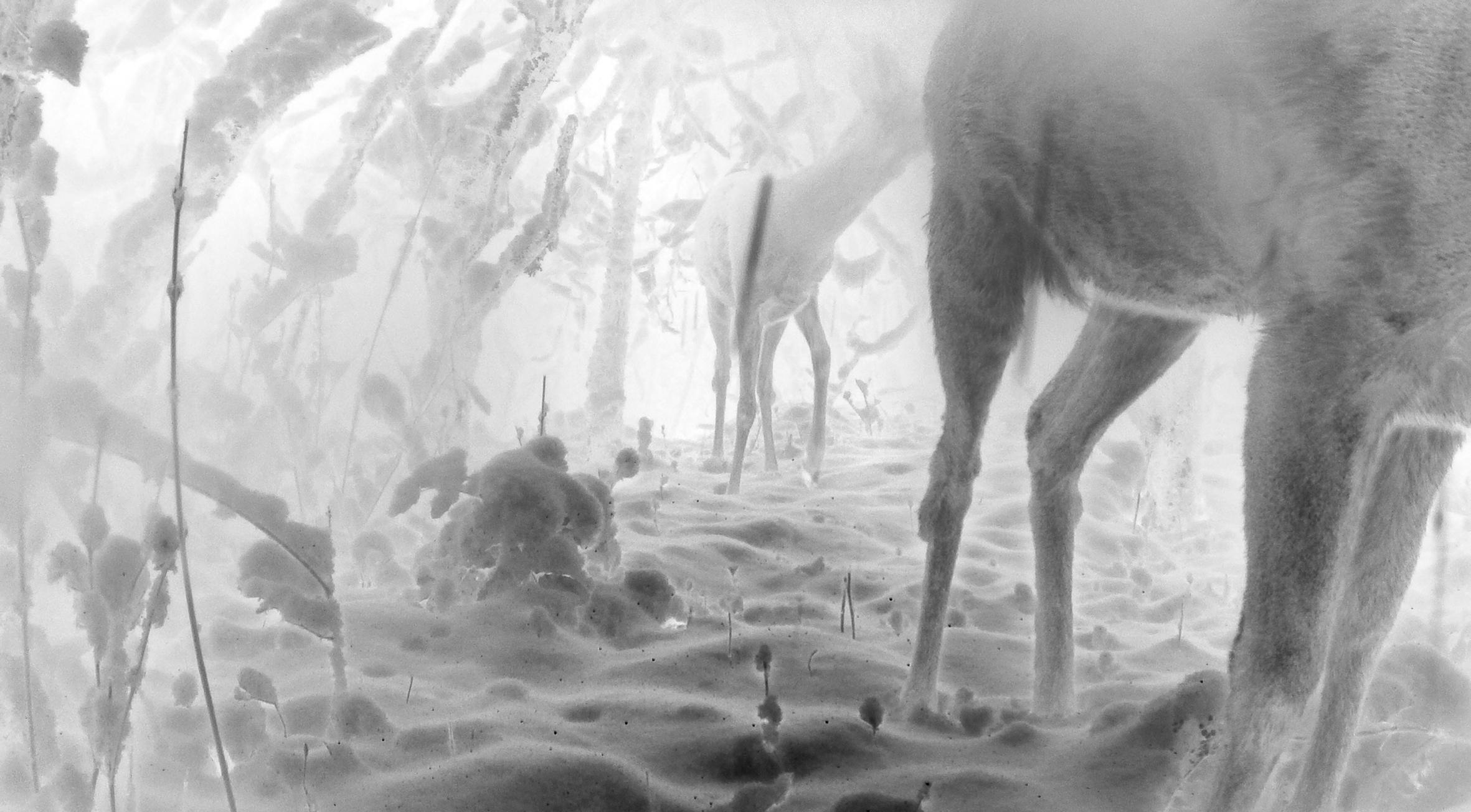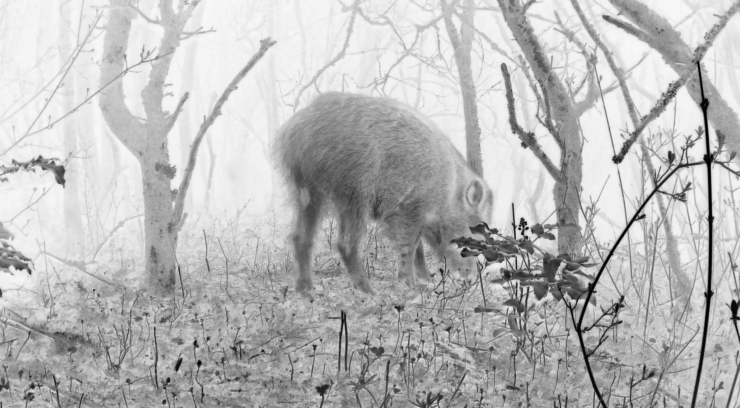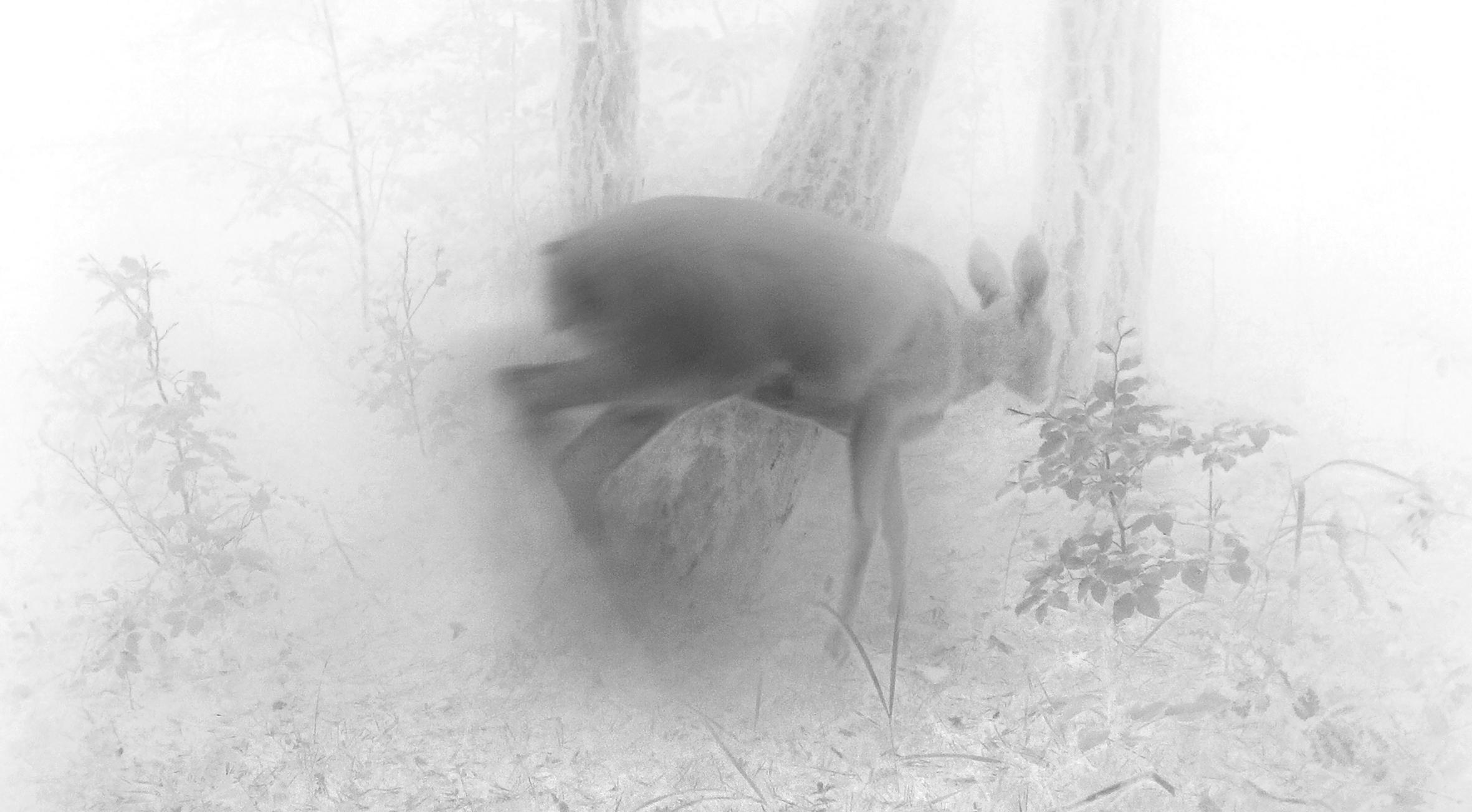 The photographs in this series were taken by a wildlife camera. Exposures were made when animals activated the camera via motion sensors, in the absence of the photographer and without his intervention. He was responsible for the preparation and follow-up work; installing the wildlife cameras in carefully selected locations and evaluating and processing the images that were generated over a period of months. The finished work is thus a co-production with the wild animals, whose decisive part — the moment the image is created — was not chosen by the photographer.