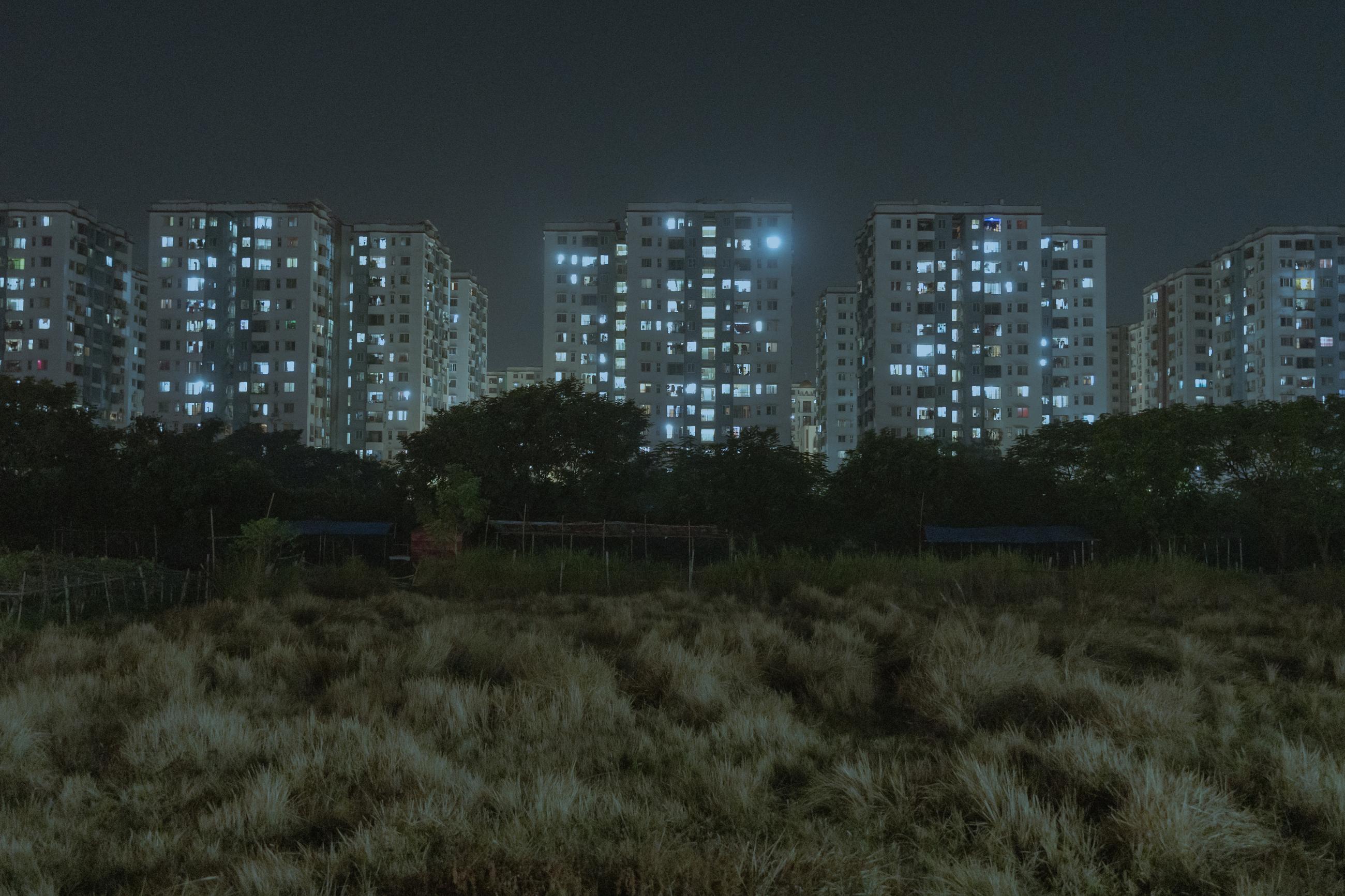 Rows of high-rise buildings form an artificial horizon, while wild, undeveloped land stretches in the foreground, a remnant of what once was. Each lit window marks a household, a vertical community, different from the open, horizontal gatherings that once filled fields and waterways.