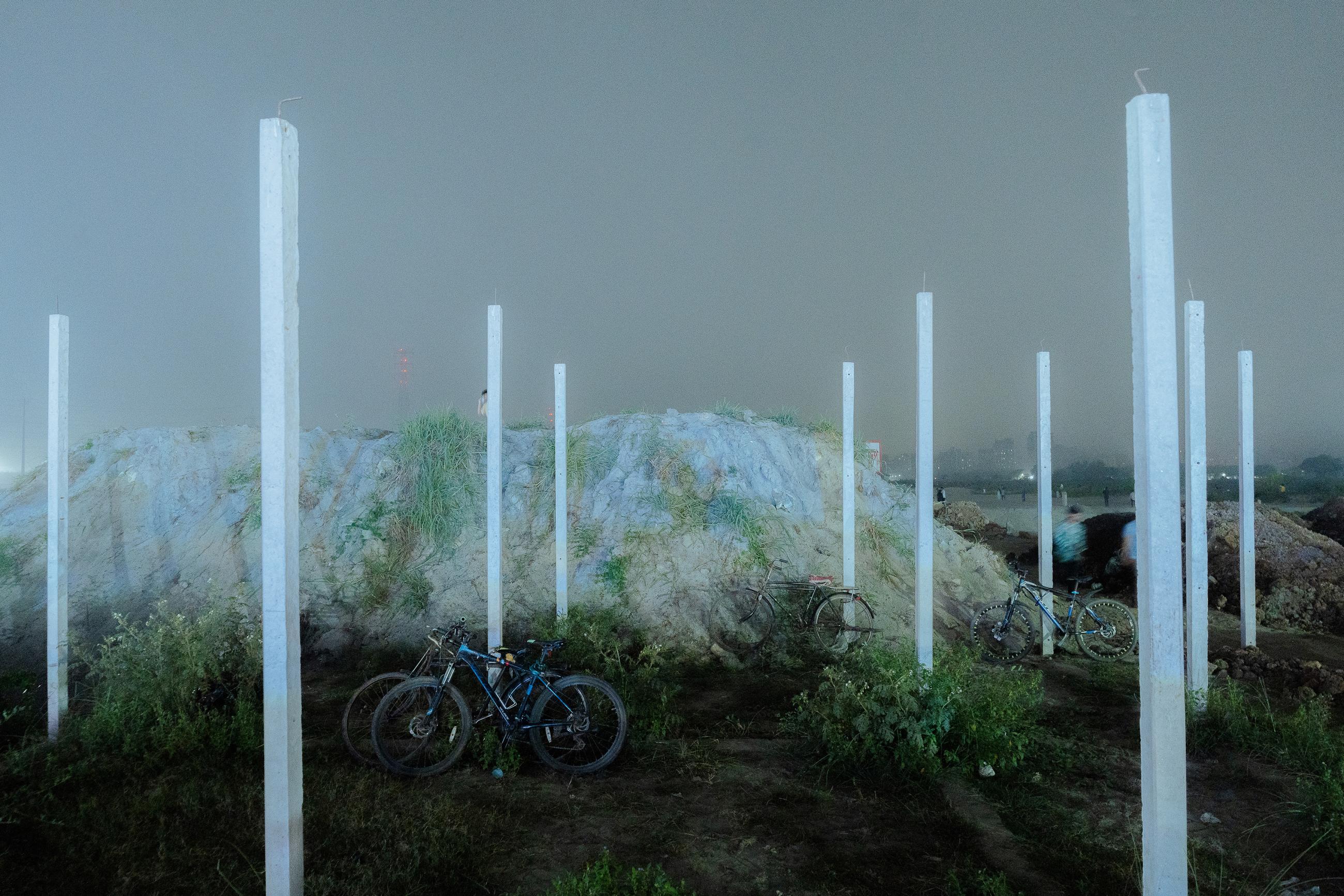 Concrete posts rise like skeletal frames against a hazy night sky, staking claims on once-open ground; bicycles lean at their base, holding onto fleeting freedom. The scene is in-between: no longer nature, not yet city. For those who once played here, these pillars are omens of a future shaped by profit.