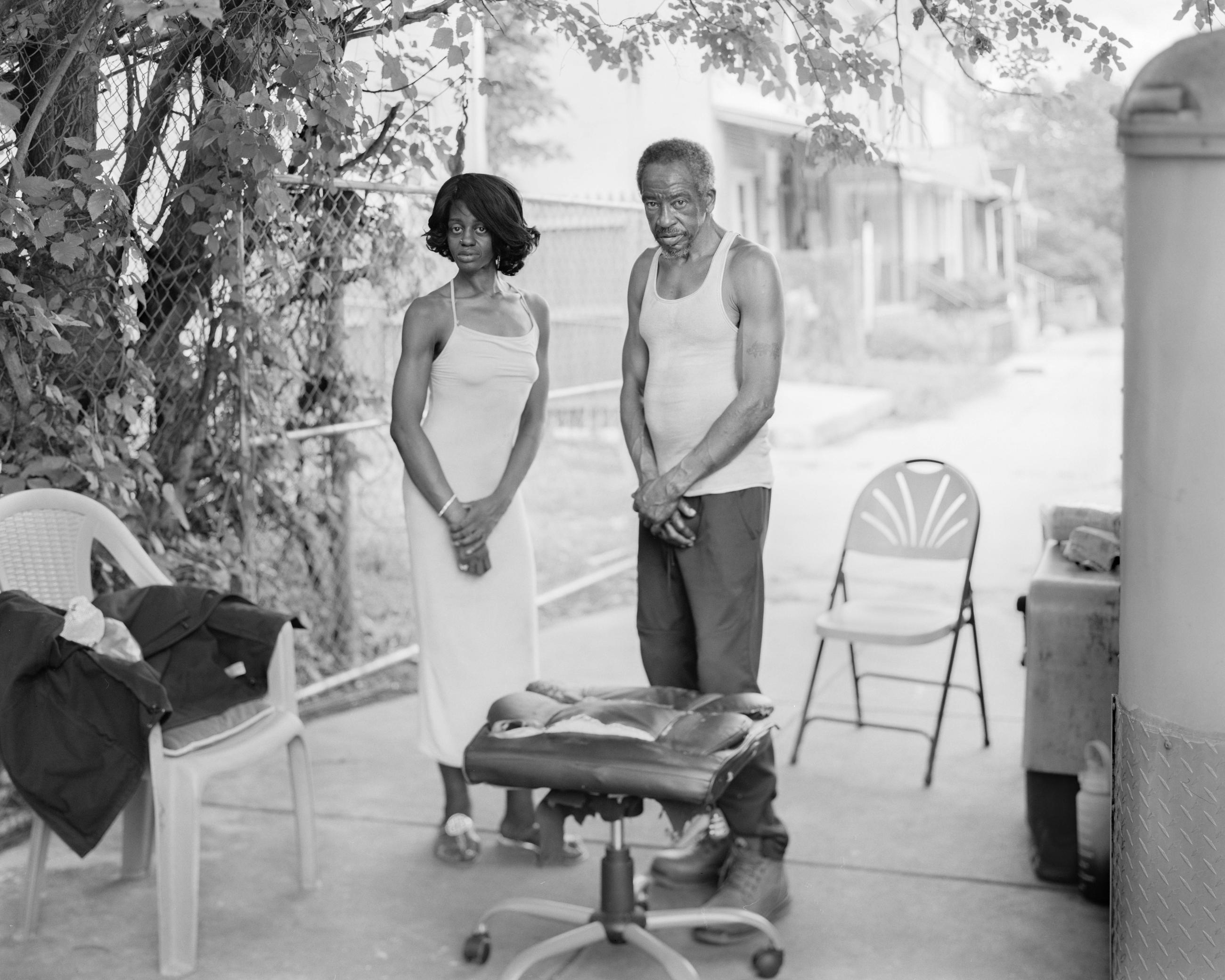 This mother and daughter drove by the photographer and were curious about his camera. He asked them to stand at this corner where the pattern in the background matches their clothing. They naturally stood in this position so the photographer asked them to hold the pose.